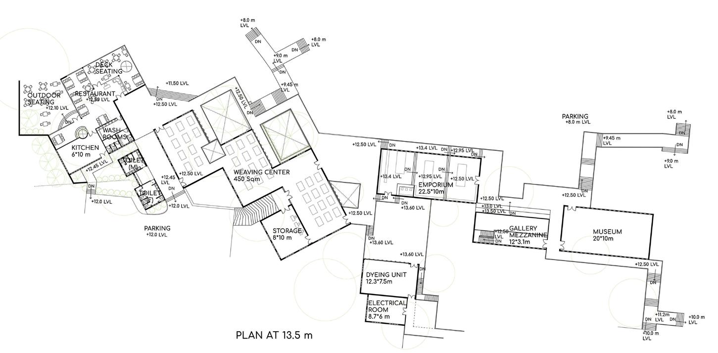 The administrative block comprises offices, both management as well as the weaver’s organisations, training halls which also can be used for community purposes, workshop areas, library and laboratories for quality check and research programs, design studios for collaborative ventures with designers. It’s also attached with accommodation and dining halls.