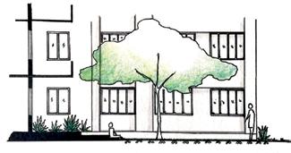The building is designed around the public square along the west edge, to provide shade during evenings. It was found that even though the sidewalks have enough width, it is not used to its potential. The public square is positioned to enhance the public realm.