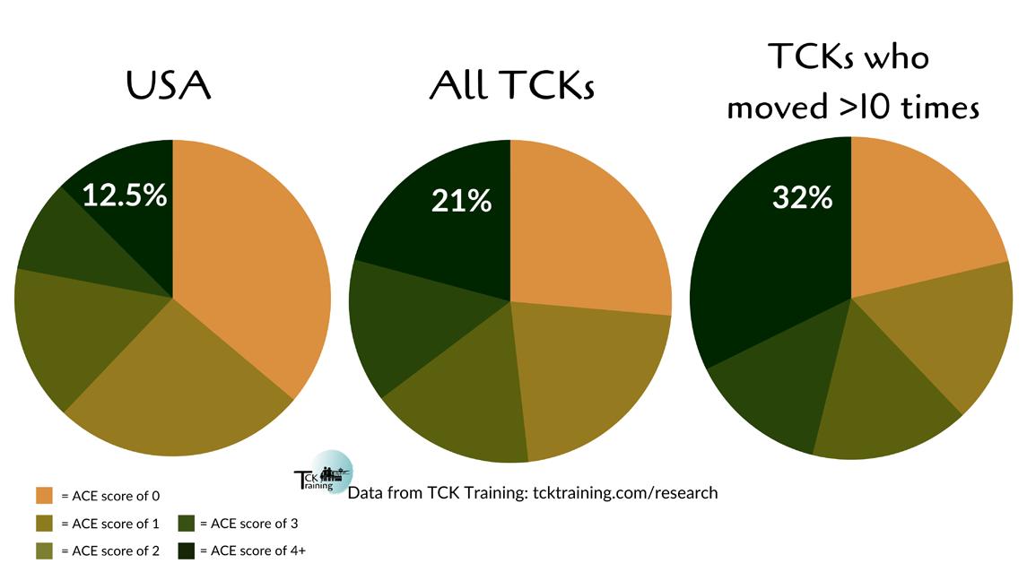 outcomes increases, often dramatically. In a survey of 17,000 Americans, 12.5 percent were at risk. Twenty-one percent of the 1,904 TCKs we surveyed were at the same risk—significantly higher than the rate of Americans.2 One in five TCKs had so many Adverse Childhood Experiences they were considered at high risk of negative outcomes in adulthood. One in three TCKs who experienced extreme mobility were at the same high risk, suggesting that mobility is in itself a risk factor.