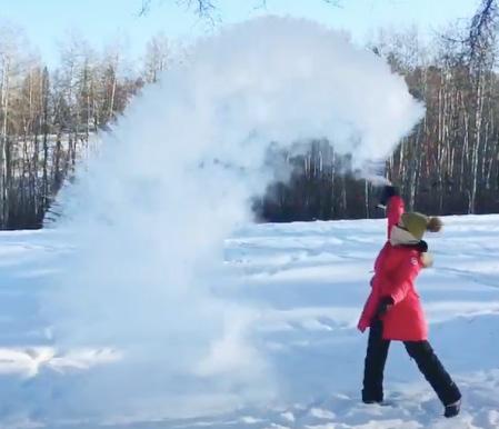 Haddie throws boiling water into the air, December 27, 2021. Windchill index on this day reached -56°F (-48°C).
