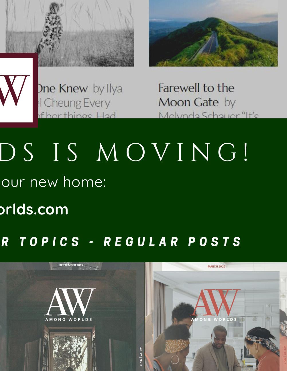 What about your upcoming issues? Our December 2022 and March 2023 issues will still be available in our beautiful digital magazine format—for FREE—but the content from these two issues will also be simultaneously added to our new online home, amongworlds.com. Our March 2023 issue will be our last digital magazine issue, published on Issuu—all future content will only be in our searchable blog format.