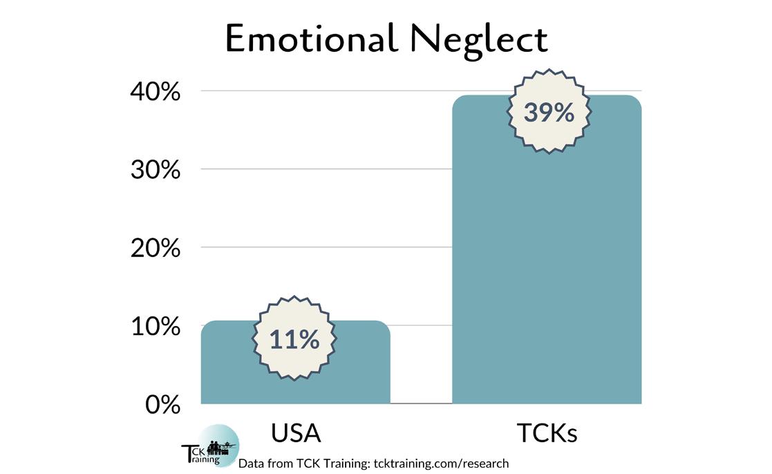 Here is one example from our research. Two out of every five TCKs we surveyed indicated they were emotionally neglected as children.3 We didn’t ask if they were neglected. We asked if as children they felt they were not loved, not special, not important, or that their family was not close and supportive. If you felt that way as a child, you are not alone. Thirty-nine percent of adult TCKs felt the same way as children. Lacking this emotional safety as a child is called emotional neglect, because the deep need we all have for emotional safety was not met.