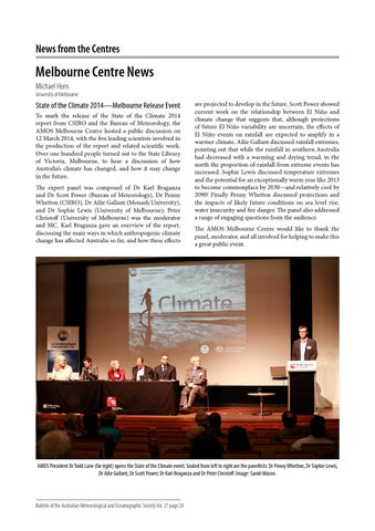 State of the Climate 2014—Melbourne Release Event To mark the release of the State of the Climate 2014 report from CSIRO and the Bureau of Meteorology, the AMOS Melbourne Centre hosted a public discussion on 12 March 2014, with the five leading scientists involved in the production of the report and related scientific work. Over one hundred people turned out to the State Library of Victoria, Melbourne, to hear a discussion of how Australia’s climate has changed, and how it may change in the future. The expert panel was composed of Dr Karl Braganza and Dr Scott Power (Bureau of Meteorology), Dr Penny Whetton (CSIRO), Dr Ailie Gallant (Monash University), and Dr Sophie Lewis (University of Melbourne); Peter Christoff (University of Melbourne) was the moderator and MC. Karl Braganza gave an overview of the report, discussing the main ways in which anthropogenic climate change has affected Australia so far, and how these effects