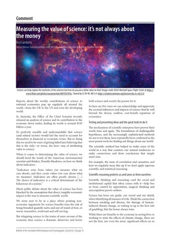 Science can help explain the mysteries of the universe but how do you put a dollar value on that? Image credit: NASA Marshall Space Flight Center at https:// www.flickr.com/photos/nasamarshall/4093925956/. Shared by CC BY-NC-ND 2.0: https://creativecommons.org/licenses/by-nc-nd/2.0/ Reports about the worthy contributions of science to national economies pop up regularly all around the world—from the UK to the US and even the developing world. In Australia, the Office of the Chief Scientist recently released an analysis of science and its contribution to the economy down under, finding its worth is around $145 billion a year. It’s perfectly sensible and understandable that science (and related sectors) would feel the need to account for themselves in financial or economic terms. But in doing this we need to be wary of getting lulled into believing that this is the only—or worse, the best—way of attributing value to science. When it comes to determining the value of science, we should heed the words of the American environmental scientist and thinker, Donella Meadows, on how we think about indicators: “Indicators arise from values (we measure what we care about), and they create values (we care about what we measure). Indicators are often poorly chosen […] The choice of indicators is a critical determinant of the behaviour of a system.” Much public debate about the value of science has been hijacked by the assumption that direct, tangible economic impact is the way to measure scientific worth. We seem now to be in a place where positing noneconomic arguments for science benefits runs the risk of being branded quaintly naïve and out-of-touch at best, or worse: insensitive, irrelevant and self-serving. But relegating science to the status of mere servant of the economy does science a dramatic disservice and leaves Bulletin of the Australian Meteorological and Oceanographic Society Vol. 28 page 35