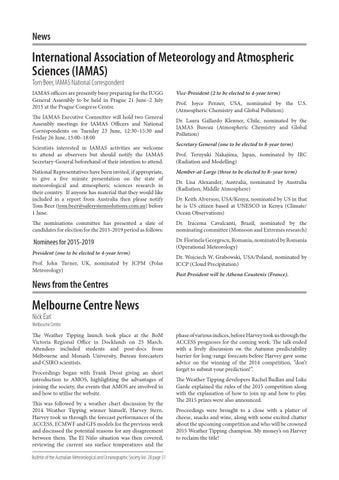 National Representatives have been invited, if appropriate, to give a five minute presentation on the state of meteorological and atmospheric sciences research in their country. If anyone has material that they would like included in a report from Australia then please notify Tom Beer (tom.beer@safesystemsolutions.com.au) before 1 June.