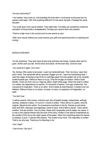 ‘It’s the machines. They click clack all day long and they lose things. Clickity clack and it’s gone. All the work you did. All the strive and sweat. All the brain drip. Gone for ever.’ ‘You could do it again. Do it over.’ ‘No. Boring. Who wants to be bored. I want my handicraft back. That I do know. Upon that point I stick. The handicraft will be resumed. Bugger you lot. I want my handwriting back. I want the magic of leaving a trail of ink on cartridge paper from the golden nib of my carefully tooled fountain pen. Without it there is no joy. Only the drudge of creation. Write a book literally. That’s me from now on. Page by silken, bright white page. When the book is written it is written. No dependence on opinion. Or intrusions of advice. Pure ego unadorned. The only pencil of inspiration. There is no other. And it needs its total freedom. It needs to be not fettered. Without it there is no hubris, no book, no story, no explosion of imagination, no spell.’ ‘You don’t say.’ ‘It will be several. Who knows. Until the next. But of beatific drudge, melancholia, self-pity, worship, whatever it takes. I’m out of it. A book is written. There will be no copies, only the original. Signed by the author. It’s provenance inscribed on the fly. Passed up and down, back and forth, sideways and edgeways, hand to hand. Until it falls to pieces. There will be another. And yet another. One at a time. Read until it physically cannot oblige. No copies. It is only in the original wherein lies the truth of the story. Written in the silence emphasised by the scratch of the nib on the virgin space of the paper. When the scratching stops the silence is washed, is pure. A silence that inspires. The scratch once more. The inspiration is written. That is my only way. Thank you for listening to me.’ ‘Can I help?’ ‘I don’t know. Can you?’