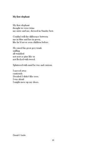 My first elephant thought we were twins my sister and me, dressed in Sunday best. Couldn’t tell the difference between me in blue and her in green, like he’d never seen children before. He raised his great grey trunk sniffing all wrinkled not neat as pins like us not flecked with tweed. Splattered with mud he was and curious. I moved away cautiously. Decided I didn’t like zoos. I was afraid I might mess up my shoes.