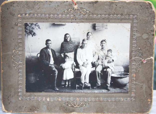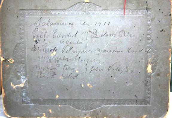 El visitar a mis primos, que revisaban el ropero de su madre después de su par da, (mi a que vivió en Salamanca, Guanajuato de la década de 1920 hasta el fin del siglo XX), me trajo sorpresas al conocer las imágenes en fotogra as de ancestros que no conocía pero que me eran mencionados en las plá cas entre mi madre y sus hermanas. Una fotogra a, que fue resguardada celosamente en su ropero, estaba dentro de un marco de cartón gris muy decorado, con una perforación donde colocaron un hilo para poderla colgarla en la pared. Las huellas que muestra la fotogra a denotan que estuvo mucho empo en el muro ates guando el día a día de la familia y seguramente los recuerdos de nuestros ancestros fueron muy apreciados integrándose en la vida familiar