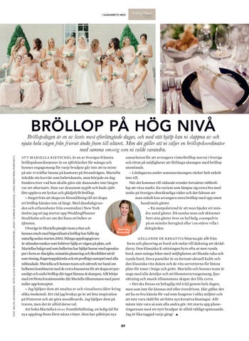 Bröllopsdagen är en av livets mest efterlängtade dagar, och med rätt hjälp kan ni slappna av och njuta hela vägen från frieriet ända fram till altaret. Men det gäller att ni väljer en bröllopskoordinator med samma omsorg som ni valde varandra. samarbeten för att arrangera vinterbröllop norrut i Sverige ATT MARIELLA RIETSCHEL är en av Sveriges främsta och tittat på möjligheter att förlänga säsongen med bröllop bröllopskoordinatorer är en självklarhet för många och utomlands. hennes engagemang för varje brudpar går inte att ta miste – Lördagarna under sommarsäsongen räcker helt enkelt på när vi träffar henne på kontoret på Strandvägen. Mariella inte till. inledde sin karriär som balettdansös, men började en dag När det kommer till rådande trender fortsätter tältbrölfundera över vad hon skulle göra när dansandet inte längre lop att växa starkt. En variant som lämpar sig extra bra med var ett alternativ. Hon var dessutom nygift och hade själv tanke på Sveriges oberäkneliga väder och det faktum att fått uppleva ett lyckat och glädjefyllt bröllop. man enkelt kan arrangera stora bröllop med upp emot – Steget från att skapa en föreställning till att skapa hundratals gäster. ett bröllop kändes inte så långt. Med dansbakgrun– En motpolstrend är att man bjuder ett minden och erfarenheter från eventsidan i New York dre antal gäster. Då samlas man och skämmer tänkte jag att jag startar upp WeddingPlanner bort sina gäster över en hel helg, exempelvis Stockholm och ser om det finns ett behov av på en mindre herrgård eller i en större villa i tjänsten. skärgården. I Sverige är Mariella pionjär inom yrket och Mariella Rietschel. hennes nisch med högexklusiva bröllop har fallit sig naturlig sedan starten 2003. Många uppdragsgivare GÄLLANDE DE KREATIVA bitarna går allt från är utlandssvenskar som behöver hjälp av någon på plats, och form och placering av bord och stolar till dukning att skrädMariellas bakgrund som ballerina har hjälpt henne med egenskadarsy. Den klassiska E-sittningen byts ofta ut mot runda per i form av disciplin, minutiös planering och flexibilitet såväl bord, men många leker med möjligheten att blanda raka och som timing, fingertoppskänsla och ett proffsigt samspel med alla runda bord. Dova pasteller är en fortsatt aktuell kulör och inblandade. Mariella och hennes team och nätverk tar hand om den klassiska vita duken och de vita servetterna får lämna helheten kombinerat med de extra finesserna för att skapa ett per- plats för toner i beige och grått. Mariella och hennes team är sonligt och unikt bröllop där inget lämnas åt slumpen. Allt börjar noga med alla detaljer och att blomsterarrangemang, ljusmed ett första kreationsmöte där Mariella tillsammans med paret sättning och musik tillsammans skapar det lilla extra. målar upp konceptet. – Det ska finnas en behaglig röd tråd genom hela dagen, – Jag hjälper dem att smalna av och visualisera idéer kring men som inte får kännas stel eller överdriven. Här gäller det olika önskemål. Ett råd jag brukar ge är att leta inspiration att ha en bra känsla för vad som fungerar i olika miljöer och på Pinterest och att göra moodboards. Jag hjälper dem på att inte vara rädd för att hitta nya kreativa lösningar. Allt traven, men det är alltid deras val. måste inte vara så som alla andra gör. Att starta upp planeAtt boka Mariella kräver framförhållning, en ledig tid för ringsresan med ett nytt brudpar är alltid väldigt spännande. Jag är lika taggad varje gång! nya uppdrag finns först nästa vinter. Hon har påbörjat nya 89