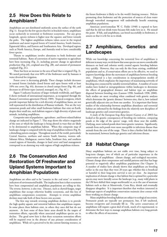 2.6 The Conservation And Restoration Of Freshwater and Upland Systems Important to Amphibian Populations Amphibians are often said to be “canaries in the coal mine” or sensitive indicators of environmental health. The implication here is that ecosystems have been compromised and amphibian populations are telling us this. The reverse, however, is also true. Diseases, such as chytrid fungus, target amphibians that occupy otherwise healthy ecosystems, and this loss of amphibians compromises ecosystems. Attempts to reverse amphibian declines must take both of these factors into account. The first step towards reversing amphibian declines is to provide the high quality aquatic and terrestrial habitats that amphibians require. In some places these habitats exist, in others they once did but do not anymore. At least some of these latter areas should be the targets of restoration efforts, especially where associated amphibian species are in decline. The good news here is that these ecosystem restoration efforts will be required even in the absence of any primary consideration of amphibians. While oil is perceived to be the current limiting resource, in