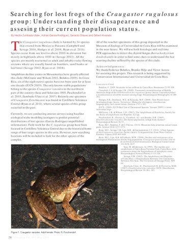 All of the voucher specimens of this group deposited in the Museum of Zoology of Universidad de Costa Rica will be examined in the near future. We will use both histologic and real time PCR approaches to detect the chytrid fungus Batrachochytrium dendrobatidis in order to find some clues to understand the fast ocurring decline suffered by the species of this clade. Acknowledgements: We thank Federico Bolaños, Branko Hilje and Víctor Acosta for assisting this project. This research is being supported by Conservation International and Universidad de Costa Rica. Literature Cited Bolaños, F. 2009. Situación de los anfibios de Costa Rica. Biocenosis 22:95-108. Campbell, J.A. & Savage J.M. (2000). Taxonomic reconsideration of Middle American frogs of the Eleutherodactylus rugulosus group (Anura: Leptodactylidae): a reconnaissance of subtle nuances among frogs. Herpetological Monographs 14:186292. Hedges, S.B., Duellman, W.E. & Heinicke, M.P. (2008). New World directdeveloping frogs (Anura: Terrarana): Molecular phylogeny, classification, biogeography, and conservation. Zootaxa 1737:1-182. IUCN. (2009). IUCN Red List of Threatened Species. Version 2009.1. <www. iucnredlist.org>. McCranie, J.R. & Wilson, L.D. (2002). The Amphibians of Honduras. Society for the Study of amphibians and Reptiles. 625 pp. Puschendorf, R., Chaves, G., Crawford, A.J. and Brooks, D.R. (2005). Eleutherodactylus ranoides. Dry forest population, refuge from decline? Herpetological Review 36:53. Ryan, M.J., Bolaños, F. & G. Chaves. (2011). Museums help prioritize conservation goals. Science 2010:1272-1273. Ryan, M.J., Savage J.M, Lips, K.R. & Giermakowski J.T. (2011). A New Species of the Craugastor rugulosus Series (Anura: Craugastoridae) from West-Central Panama. Copeia 2010:405-409. Ryan, M.J., Lips, K.R. & Eichholz, M.W. (2008). Decline and extirpation of an endangered Panamanian stream frog population (Craugastor punctariolus) due to an outbreak of chytridiomycosis. Biological Conservation 141:1636-1647. Sasa, M. &Solórzano, A. (1995). The reptiles and amphibians of Santa Rosa National Park, Costa Rica, with comments about the herpetofauna of xerophytic areas. Herpetological Natural History 3:113-126. Savage, J.M. (2002). The Amphibians and Reptiles of Costa Rica: a Herpetofauna Between Two Continents, Between Two Seas. The University of Chicago Press. 909 pp. Zumbado-Ulate, H., Puschendorf, R. & Chavarría, M.M. (2007). Eleutherodactylus ranoides (NCN) Distribution. Herpetological Review 38:184–185.