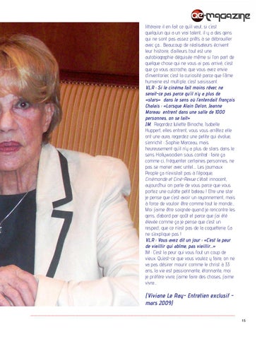 littéraire il en fait ce qu’il veut, si c’est quelqu’un qui a un vrai talent, il y a des gens qui ne sont pas assez prêts à se débrouiller avec ça… Beaucoup de réalisateurs écrivent leur histoire, d’ailleurs tout est une autobiographie déguisée même si l’on part de quelque chose qui ne vous ai pas arrivé, c’est que ça vous accroche, que vous avez envie d’inventorier, c’est la curiosité parce que l’âme humaine est multiple, c’est saisissant. V.L.R : Si le cinéma fait moins rêver, ne serait-ce pas parce qu’il n’y a plus de «stars» dans le sens où l’entendait François Chalais : «Lorsque Alain Delon, Jeanne Moreau entrent dans une salle de 1000 personnes, on se tait» J.M. Regardez Juliette Binoche, Isabelle Huppert, elles entrent, vous vous arrêtez elle ont une aura, regardez une petite qui évolue, s’enrichit : Sophie Marceau, mais heureusement qu’il n’y a plus de stars dans le sens Hollywoodien sous contrat : faire ça comme ci, fréquenter certaines personnes, ne pas se marier avec untel…. Les journaux People ça n’existait pas à l’époque, Cinémonde et Ciné-Revue c’était innocent, aujourd’hui on parle de vous parce que vous portez une culotte petit bateau ! Etre une star je pense que c’est avoir un rayonnement, mais à force de vouloir être comme tout le monde… Moi j’aime être soignée quand je rencontre les gens, d’abord par goût et parce que j’ai été élevée comme ça je pense que c’est un respect, que ce n’est pas de la coquetterie. Ca ne s’explique pas ! V.L.R : Vous avez dit un jour : «C’est la peur de vieillir qui abîme, pas vieillir…» JM : C’est la peur qui vous fout un coup de vieux. Qu’est-ce que vous voulez y faire, on ne va pas désirer mourir comme le christ à 33 ans, la vie est passionnante, étonnante, moi je préfère vivre, j’aime faire des choses, j’aime vivre…