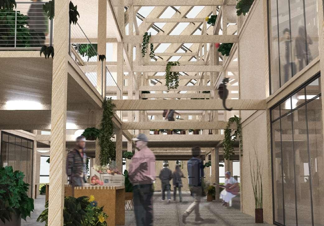 The largest is the passive buffer zone, situated between the exterior structure and the interior CLT frame. This zone accommodates circulation and interaction throughout the structure.