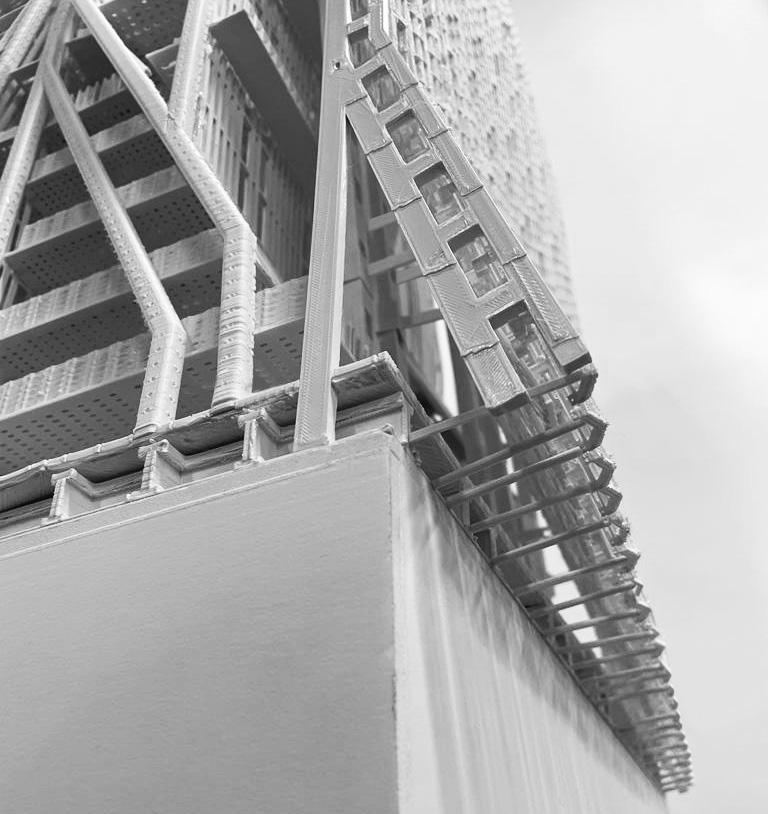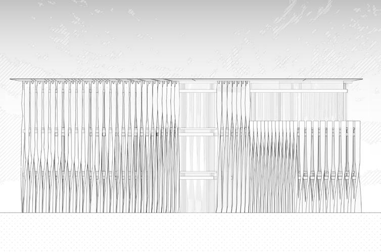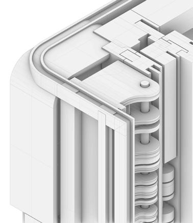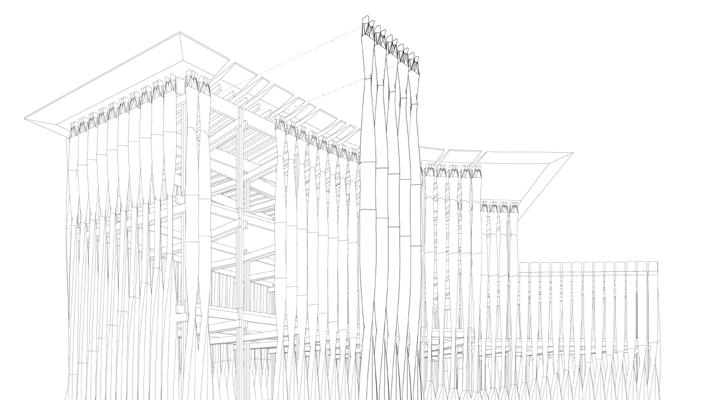 The assembly logics used in the facade are slotting, nesting, and interlocking to maintain the linearity of elements while also connecting them sectionally and to connect the lighter hanging elements to the chunkier base structure.