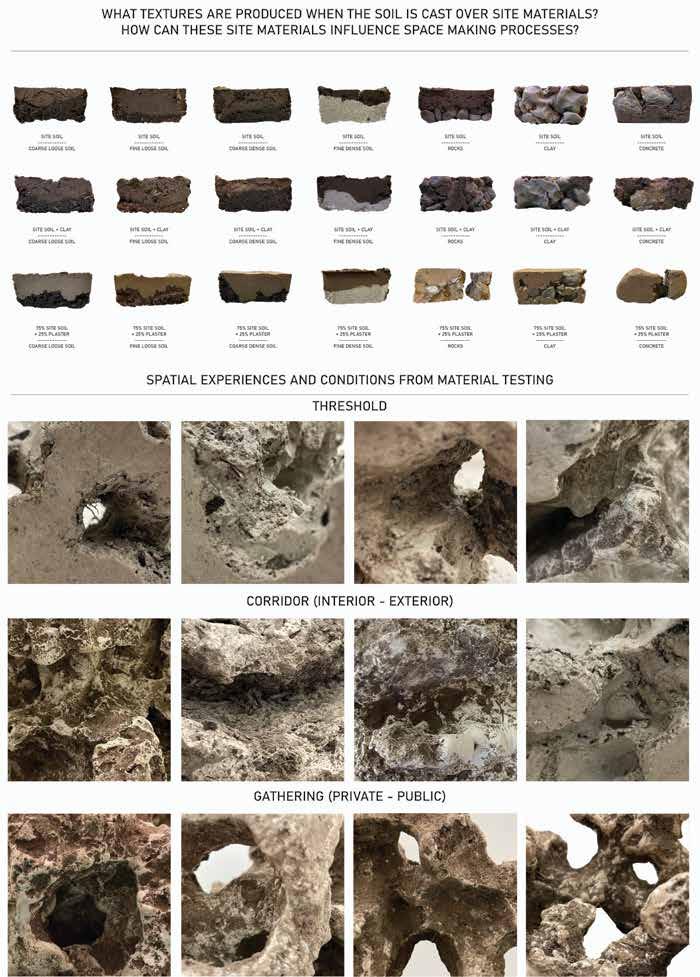 This research posits that a revitalization of indigenous earth architecture practices in a contemporary context can mitigate waste in the construction industry. Looking at how earth materials can be returned to the natural environment when utilized in a circular consumption cycle, structural capabilities are tested in forms derived soil’s tectonic logic.