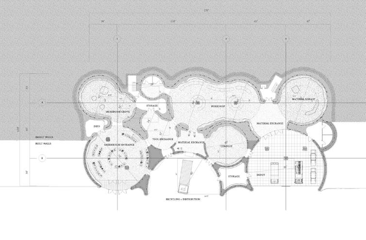 This proposal for a recycling hub and material library in Iceland engages the ideology of a circular economy. Earth materials from the site directly support the community and influence the formal and aesthetic choices of the design.