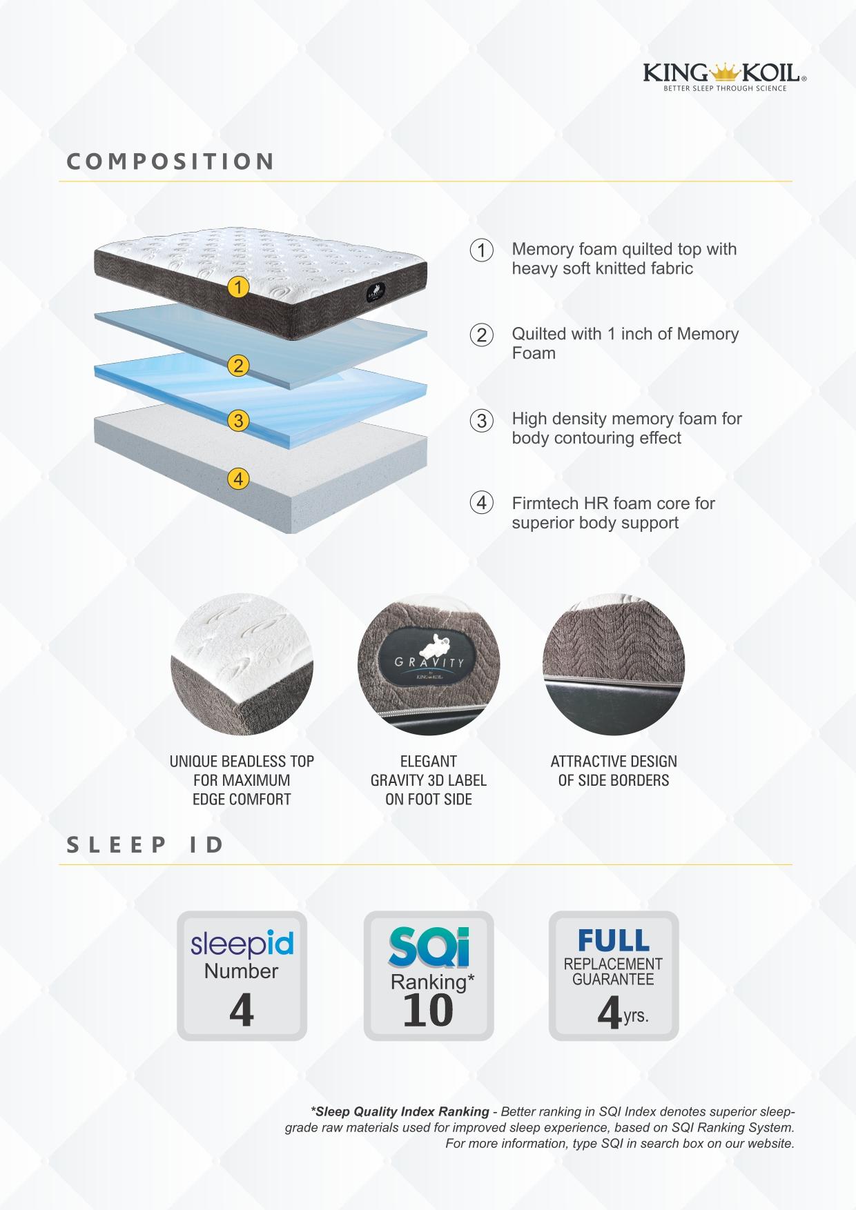 Gravity features a perfect blend of body contouring high density Ortho Memory Foam and supportive High Resilient Foam in the core to support the body and back, with the former being placed on top of the latter.