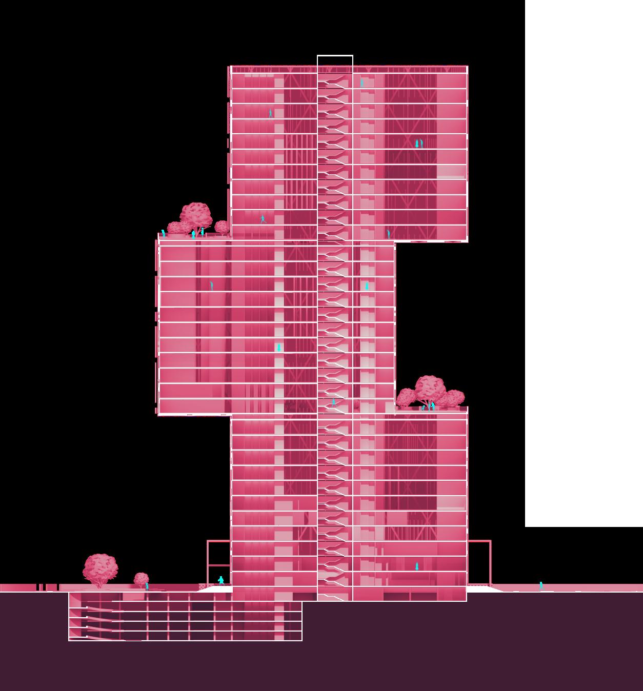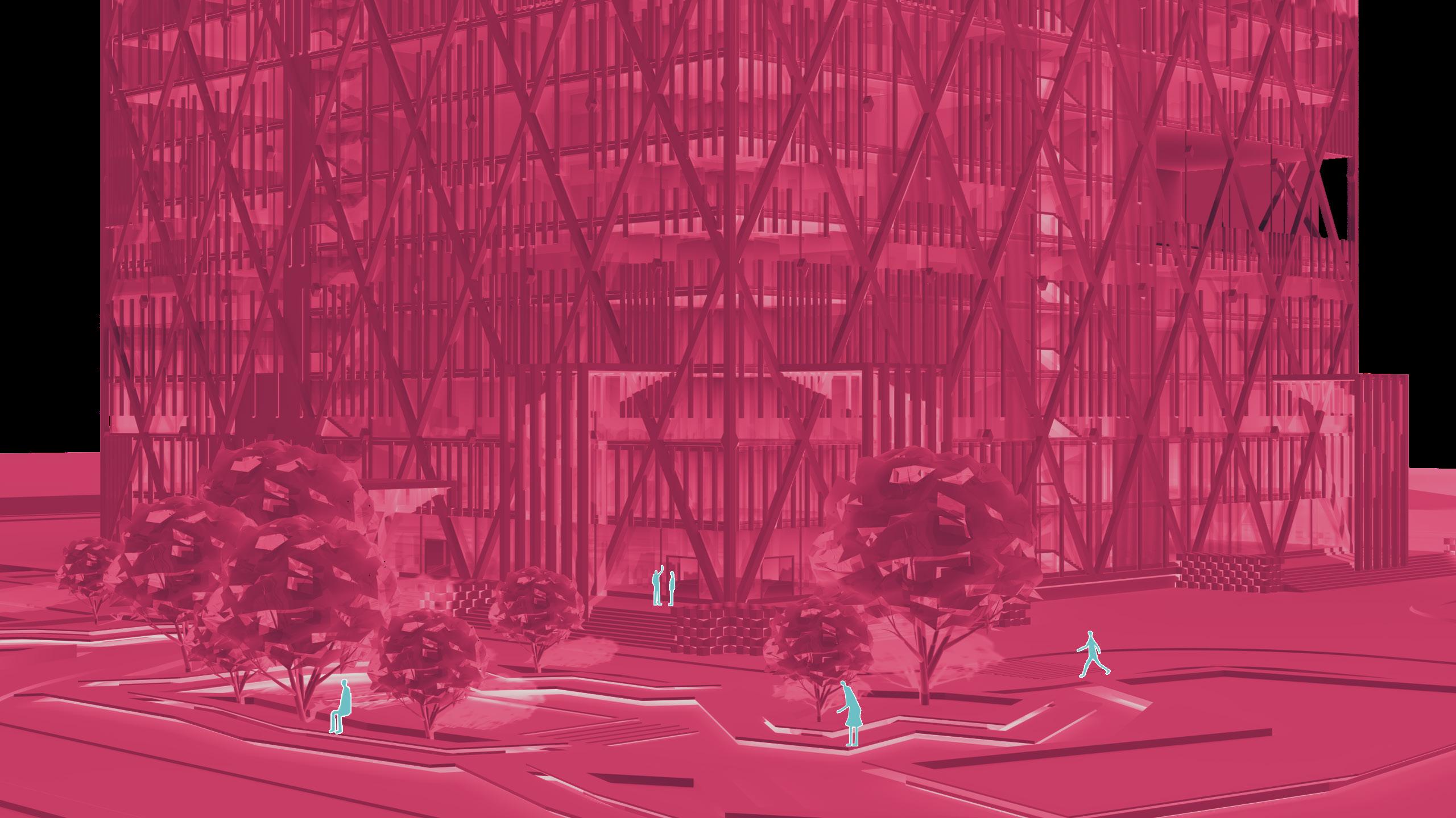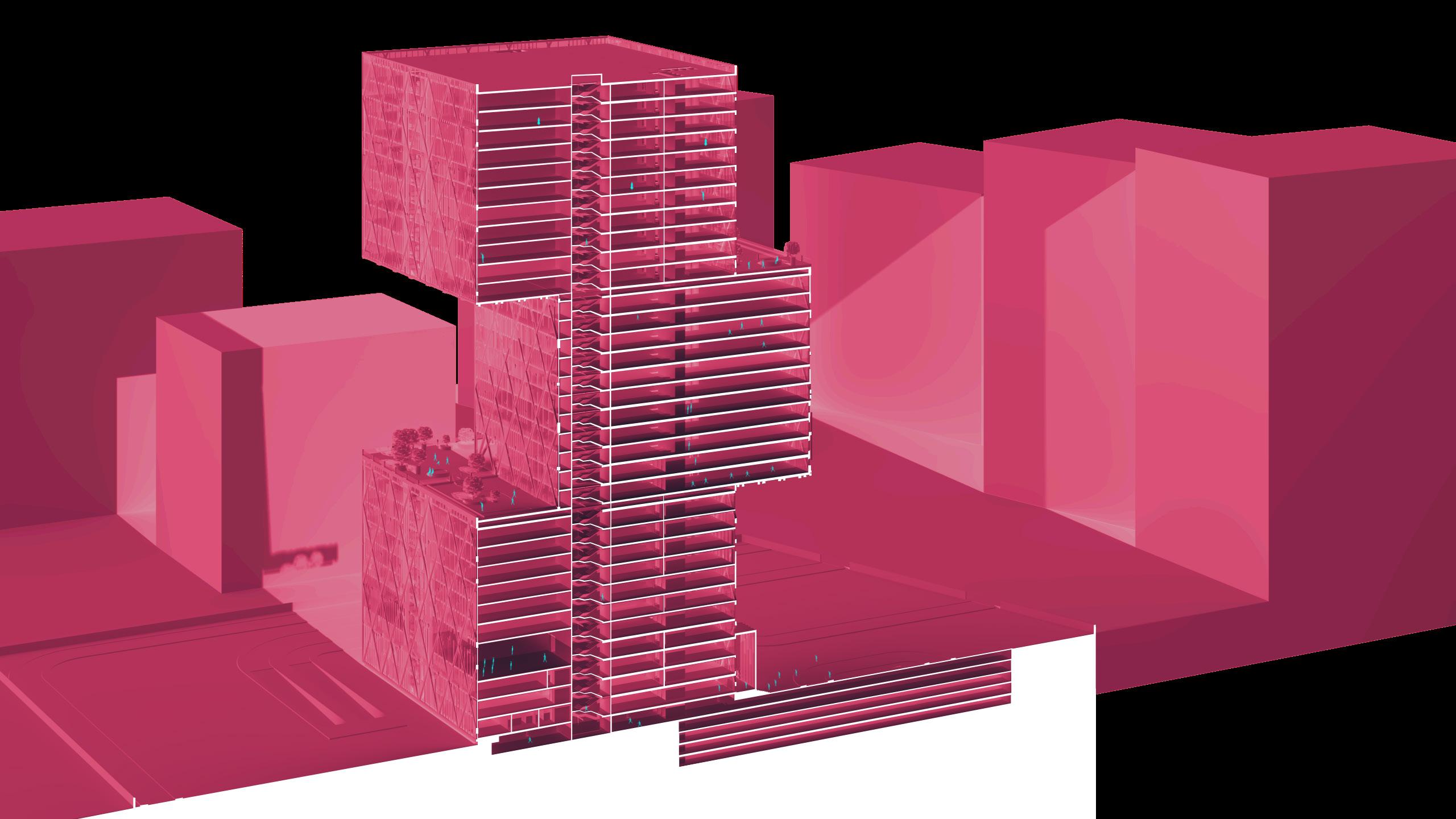 A simple form of stacked cubes maximising the purpose of a high rise structure. This design consists of a Convention Center, Gymnasium, and Offices, that are structurally supported by a Diagrid System.