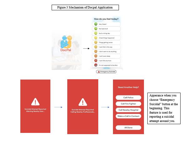 1. When users open the app, there will be a mental health pain scale questionnaire that they have to fill out. Besides that, there will be an emergency suicidal call button.Users should selectthis button if users are not usingit as a patient but as someonewho wants to report a suicidal attempt near them.