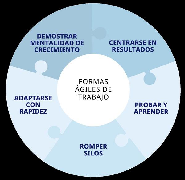 Para ayudar a los colleagues a adoptar una mentalidad ágil, es importante comprender cada uno de los comportamientos centrales que conforman las formas ágiles de trabajar. Muchas personas están familiarizadas con la frase “Probar y Aprender” y probablemente ya la apliquen en su trabajo de manera regular. Probar y aprender es una de las formas ágiles de trabajar y se define formalmente como la realización de experimentos rápidos para habilitar bucles de retroalimentación rápidos; esto proporciona datos para ayudarnos a tomar decisiones informadas y cambiar de dirección según sea necesario.