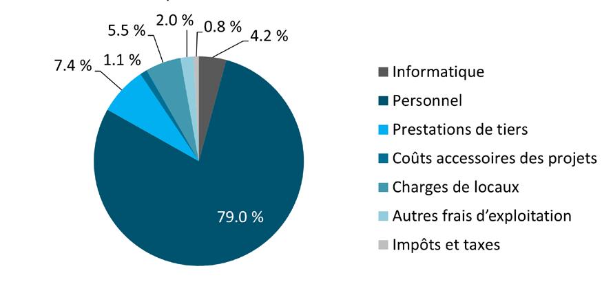 Comme nous sommes un prestataire de services, les coûts du personnel représentent une part importante de notre budget, à savoir près de 80 %. Un autre poste important sont les prestations de tiers, comme les commandes aux sous-traitants. Les coûts restants sont répartis entre dépenses informatiques, coûts accessoires des projets, charges de locaux, autres frais d’exploitation et taxes et impôts.
