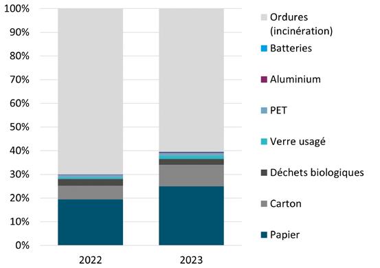 En tant que prestataire de services, nous n’achetons presque aucune marchandise en comparaison avec l’industrie et les entreprises de production. Ces coûts d’achat représentent par conséquent une faible part de nos coûts globaux (pour de plus amples informations, voir la rubrique Performance économique). Une grande partie de nos achats est consacrée au matériel informatique et aux logiciels, aux fournitures de bureau et à l’équipement des bâtiments.