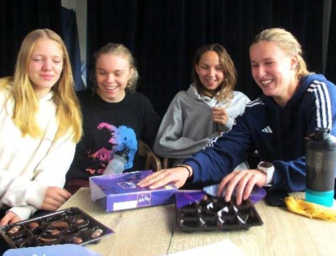 Ik zit nog niet klaar voor het interview of er knalt een dubbellaagse A4-doos bonbons op tafel. Graaiende handen van vier 17- en 18-jarige meiden vinden razendsnel hun weg naar de versnaperingen. Met volle monden schuiven ze aan en weten tussen twee happen door net hun naam te mompelen. Als ik vervolgens een foto wil nemen, volgt een bliksemsnelle schaamte-actie om de doos buiten beeld te schuiven—maar ik was sneller. Haha! Betrapt.