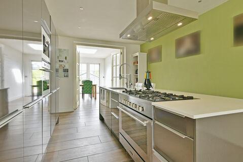Ietsverderopindewoonkamerligtderuimeopen keukenmetkookeiland,welkebeschiktoveralle benodigdeapparatuur(o.a.6-pitsgasfornuismet wokbranderenoven,afzuigkap,spoelbak,close-in boiler,ingebouwdekoffiemachine,koelvriescombinatie,combi-magnetronenvaatwasser).
