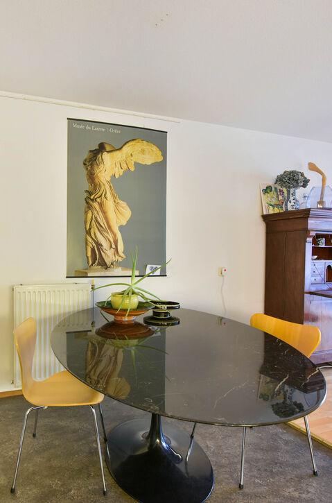 The semi-open kitchen connects to the living and dining area. The whole is placed in an L-shape and equipped with various built-in appliances such as an oven / microwave, induction hob, dishwasher and a fridge / freezer. The dining room is also spacious