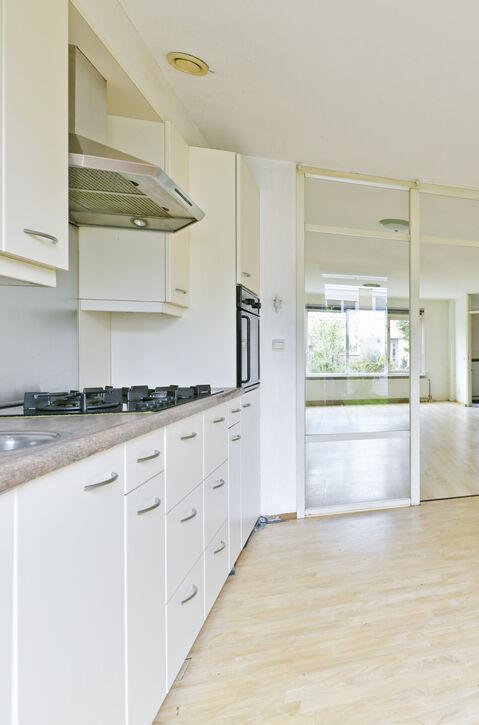 Dekeukenismiddelseenglaspuigescheidenvande woonkamer.Hieriseeneenvoudigekeuken geplaatstineenwandopstelling,waarbijje voldoendekast-enwerkruimtetotjebeschikking hebt.Isdekeukentochniethelemaaljouwsmaak? Dankanjeereventueelvoorkiezenjouweigen droomkeukenterealiserenindekleurenopstelling die jij wenst.