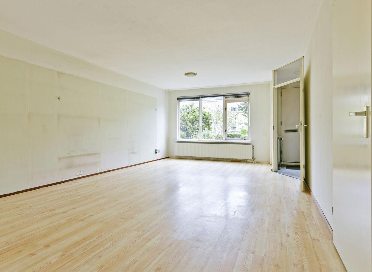 Het woongedeelte bevindt zich aan de voorzijde van het huis en dankzij het grote raam valt hier aangenaam veel daglicht naar binnen. Op de vloer ligt laminaat en de wanden kunnen nog volledig naar eigen wens worden afgewerkt.