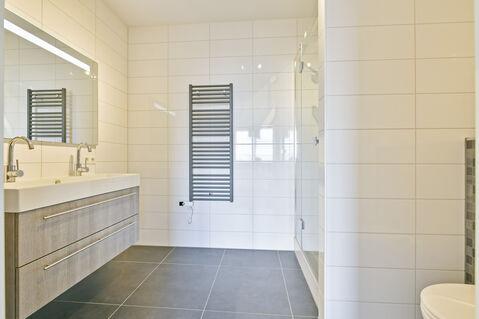 De moderne badkamer is volledig betegeld in een neutrale kleurstelling en compleet ingericht met een dubbel wastafelmeubel met opbergruimte en spiegel, wandkast, tweede wandcloset (Sanybroyeur), handdoekenradiator en een douchecabine.