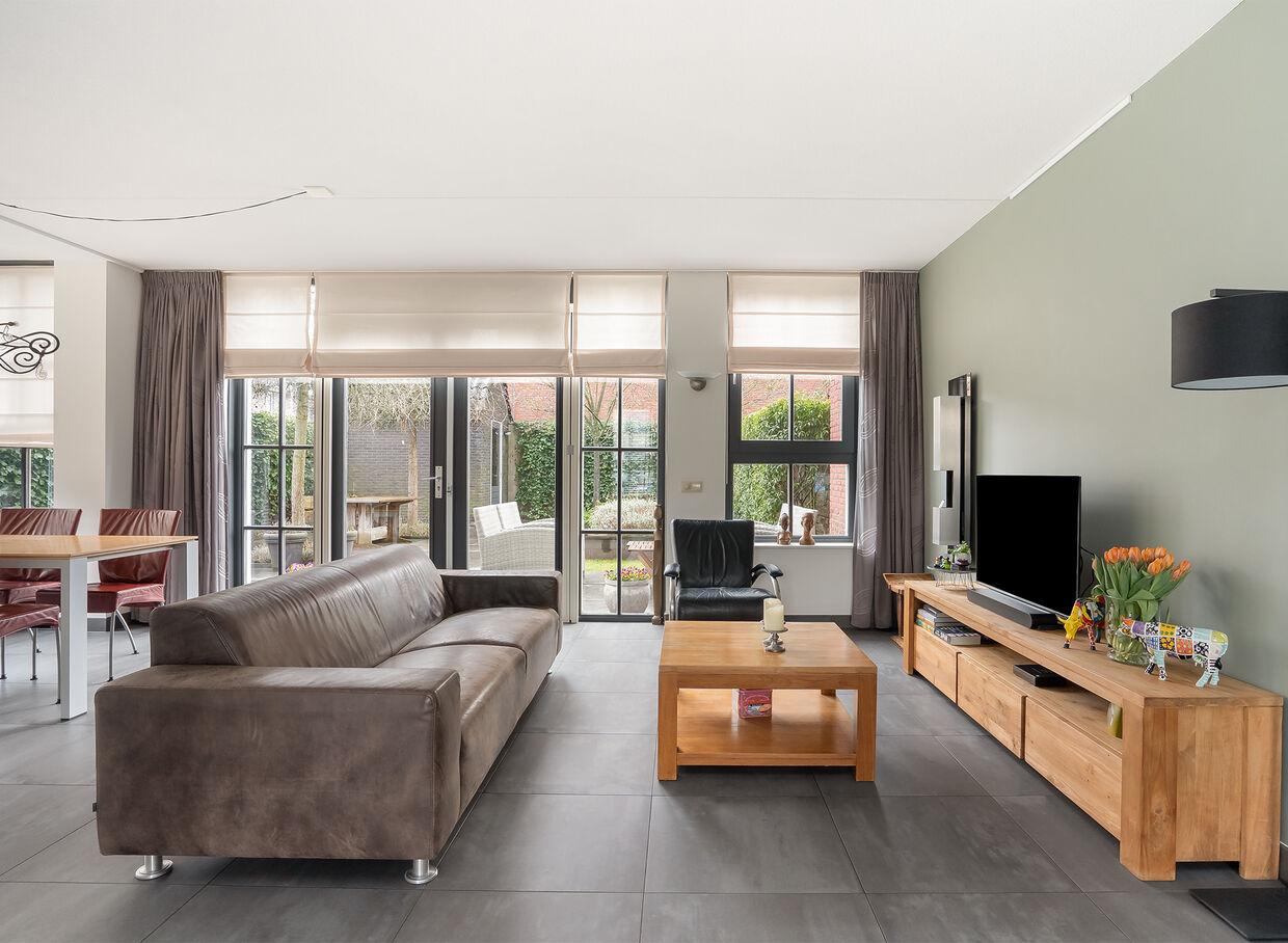 Vanuit de hal kom je de ruime, tuingerichte woonkamer met sfeervolle zij-erker binnen. De open indeling en vele grote (roede) ramen maken dat de woonkamer heerlijk ruimtelijk en licht aanvoelt. Op mooie dagen zet je de openslaande tuindeuren natuurlijk lekker open en fungeert de tuin meteen als verlengde van de leefruimte.