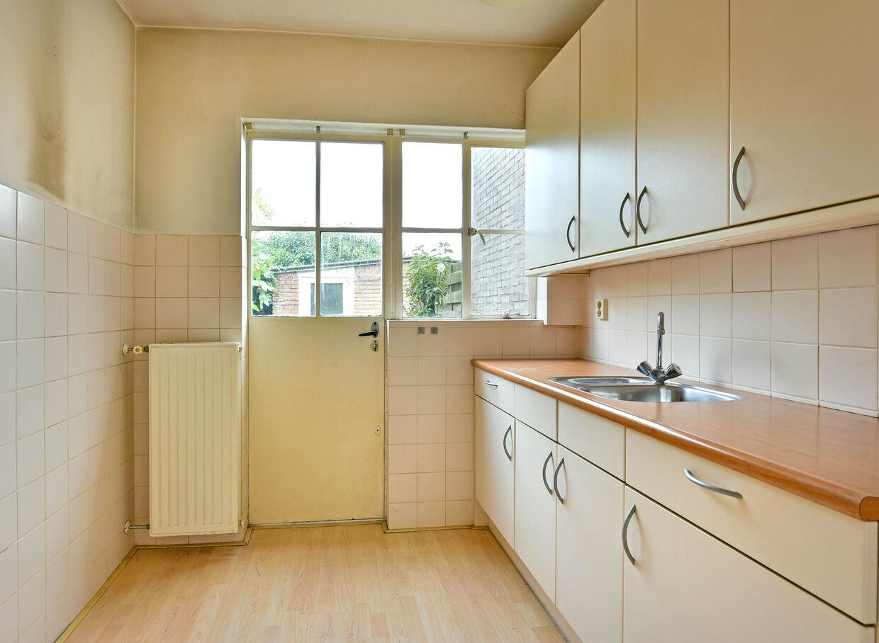 Aan de achterzijde van de woning is de dichte keuken, voorzien van een simpel keukenblok gesitueerd waarbij je toegang tot de achtertuin krijgt.