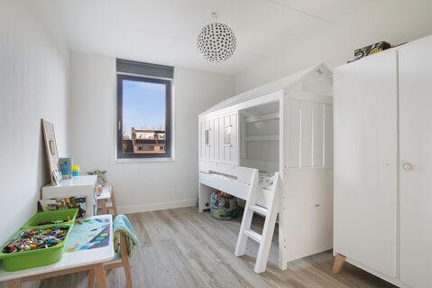 Vanuit het ruim opgezette trappenhuis zijn alle vertrekken toegankelijk. Eén kinderkamer aan de voorzijde en twee aan de achterzijde van de woning. Dit is dan ook met recht de kinderverdieping geworden. Ook deze verdieping is afgewerkt met PVC vloeren en een combinatie van strakke wandafwerking en een eigentijds behang.