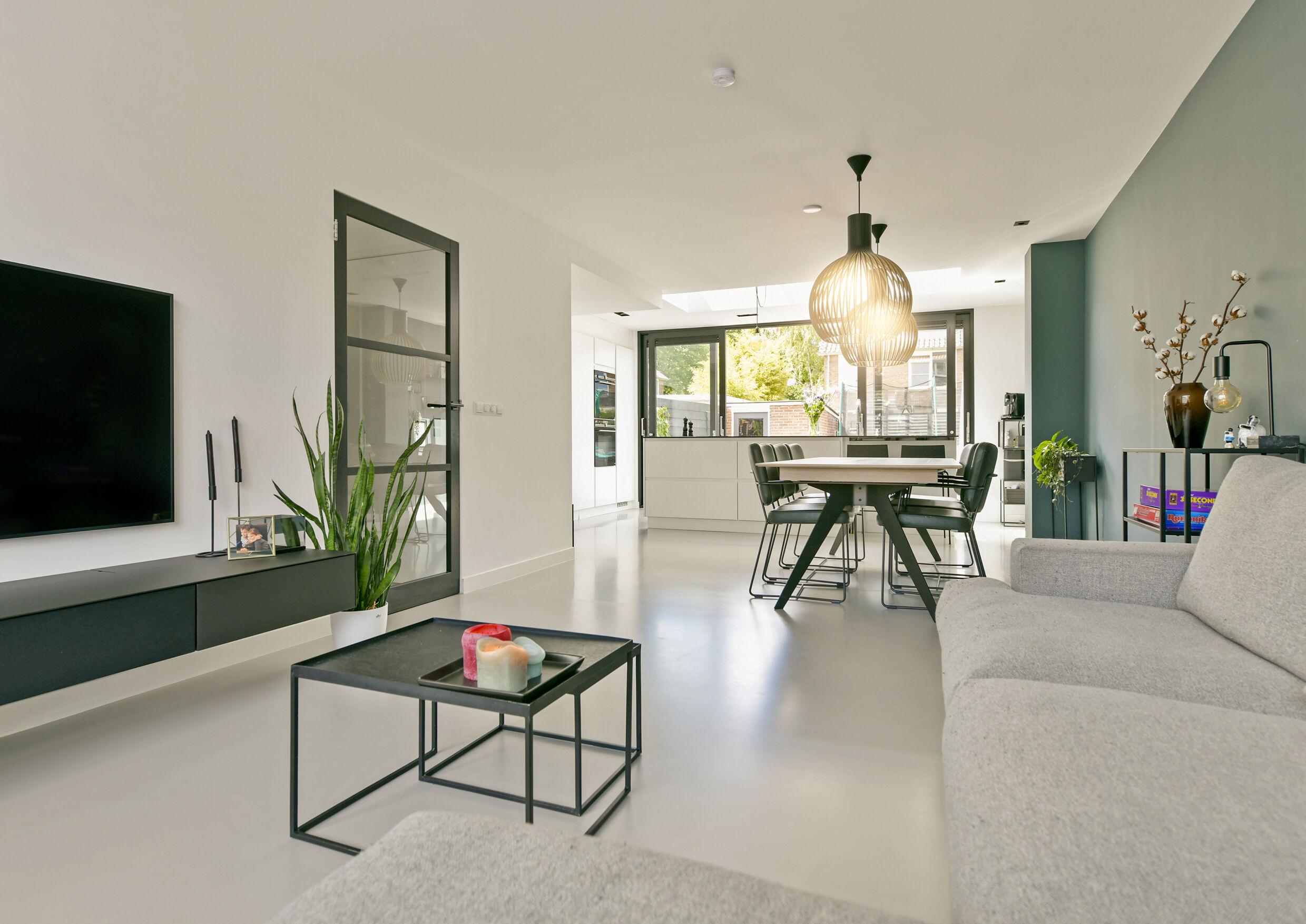 De schitterende gietvloer is door de gehele woning gelegd met daaronder op de begane grond natuurlijk de vloerverwarming. Ruime uitgebouwde woonkamer met aan de voorzijde een zithoek.