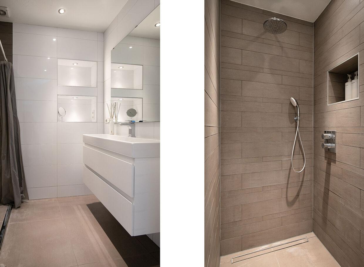De bruin/wit modern betegelde badkamer beschikt over een inloop regendouche en designvolle details. Het separate toilet is in dezelfde moderne stijl en kleuren betegeld.