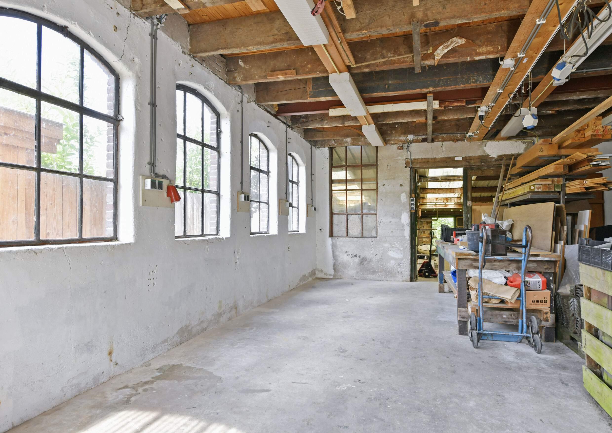 Riant bijgebouw met prachtige originele stalen kozijnen. Het bijgebouw is droog en heeft een vliering voor nog meer opslagmogelijkheden.
