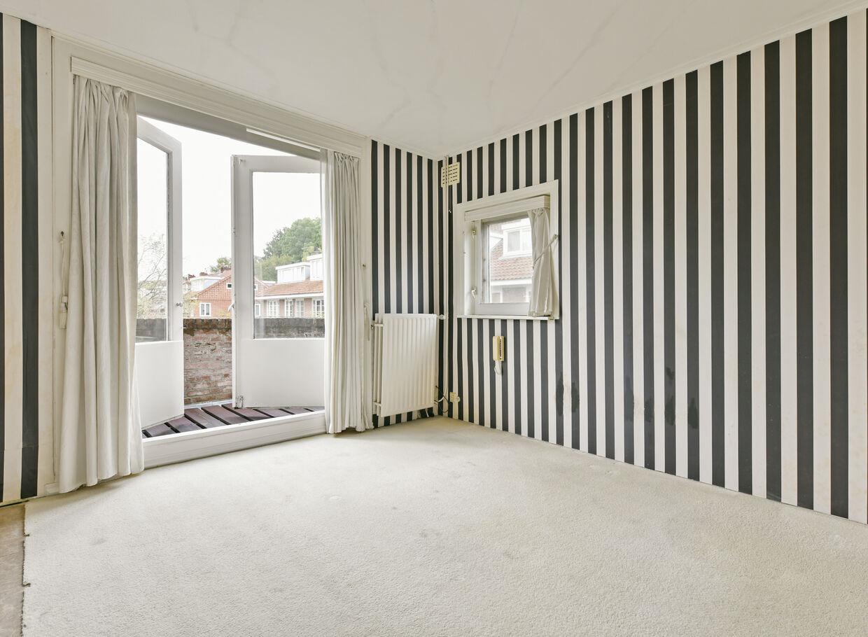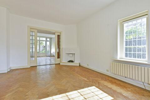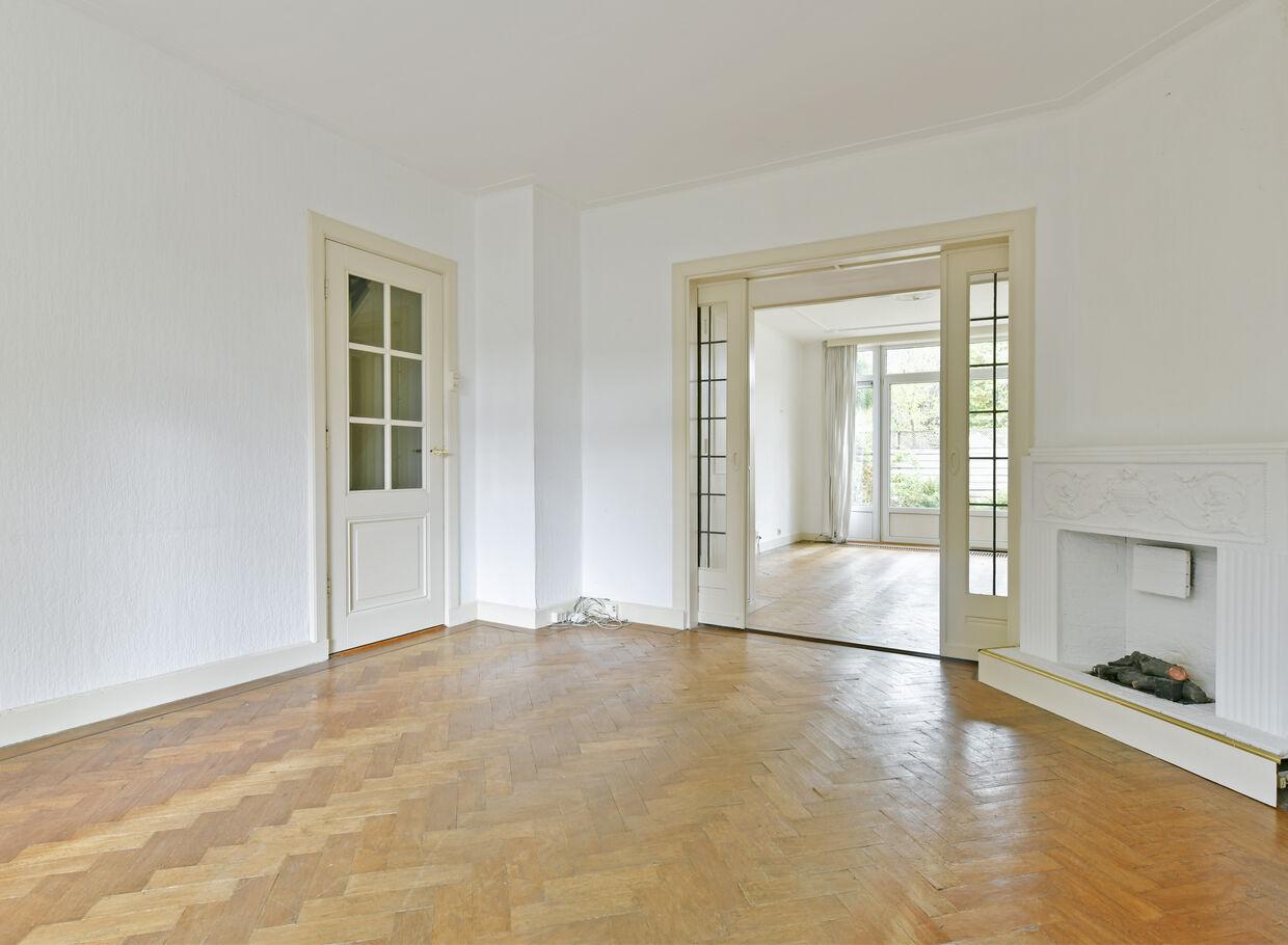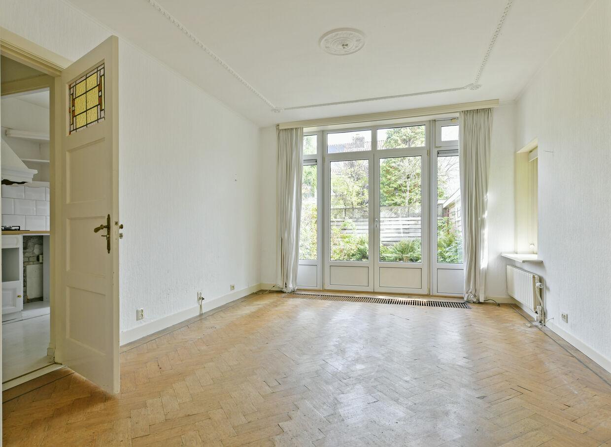 De doorzon woonkamer voelt erg licht doordat deze aan drie zijden lichtinval ontvangt. Tevens beschikt deze nog over de originele kamer en suite deuren met kast en twee karakteristieke glas in lood zijramen alsmede erker.