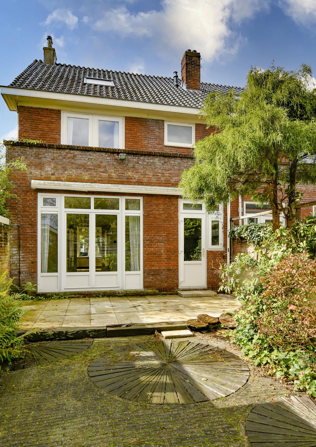 Viadeentreebetreedtudenogdeelsauthentieke vestibulevandewoning.Vervolgensbetredenwede halmetorigineletrapopgang,keldertrapmet meterkast,gastentoiletentoegangtotdekeukenen woonkamer.Dedoorzonwoonkamervoelterglicht doordatdezeaandriezijdenlichtinvalontvangt. Tevensbeschiktdezenogoverdeoriginelekameren suitedeurenmetkastentweekarakteristiekeglasin loodzijramenalsmedeerker.Dedubbele terrasdeurenzorgenvooreenprettigeovergang naardeachtertuin.Maarhetiseveneensmogelijk hetwoonoppervlakaanzienlijkteverruimenmiddels een uitbouw.