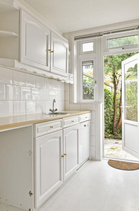De dubbele terrasdeuren zorgen voor een prettige overgang naar de achtertuin (oriëntatie oosten). Maar het is eveneens mogelijk het woonoppervlak aanzienlijk te verruimen middels een uitbouw. Uiteraard is het ook mogelijk de naastgelegen keuken met de woonkamer te verbinden.
