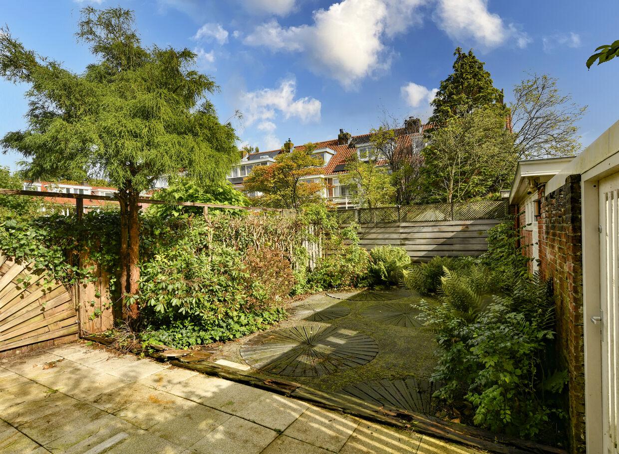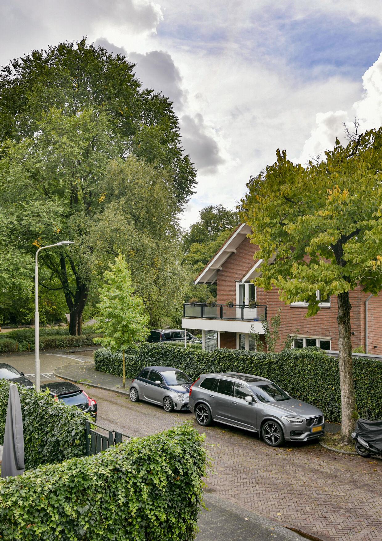 Along the house you can park several cars on private property and you have access to the garage which is located at the back of the plot. The backyard is located on the east and mainly looks away towards the greenery of the surrounding gardens. This is accessible through the living room, kitchen, side gate