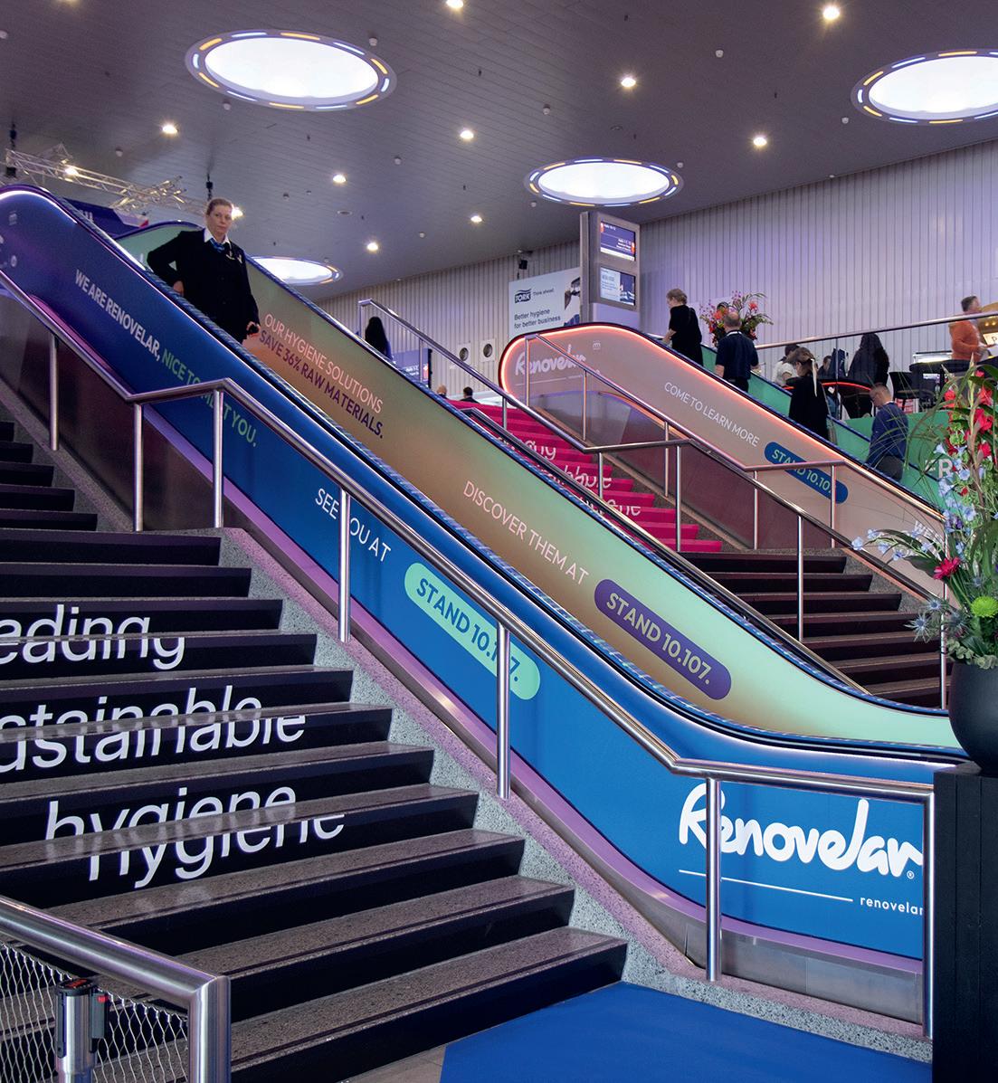 Get the attention of the visitors by branding the complete fly over between hall 8 and hall 7. A real eye catcher in order to visualize a story.