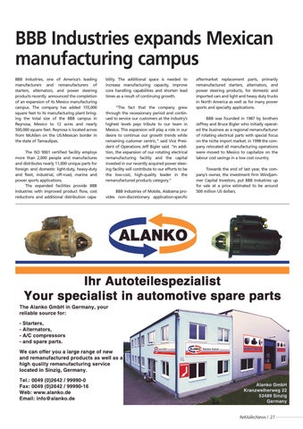 BBB Industries expands Mexican manufacturing campus BBB Industries, one of America’s leading manufacturers and remanufacturers of starters, alternators, and power steering products recently announced the completion of an expansion of its Mexico manufacturing campus. The company has added 155,000 square feet to its manufacturing plant bringing the total size of the BBB campus in Reynosa, Mexico to 12 acres and nearly 500,000 square feet. Reynosa is located across from McAllen on the US-Mexican border in the state of Tamaulipas. The ISO 9001 certified facility employs more than 2,000 people and manufactures and distributes nearly 11,000 unique parts for foreign and domestic light-duty, heavy-duty and fleet, industrial, off-road, marine and power sports applications. The expanded facilities provide BBB Industries with improved product flow, cost reductions and additional distribution capa-