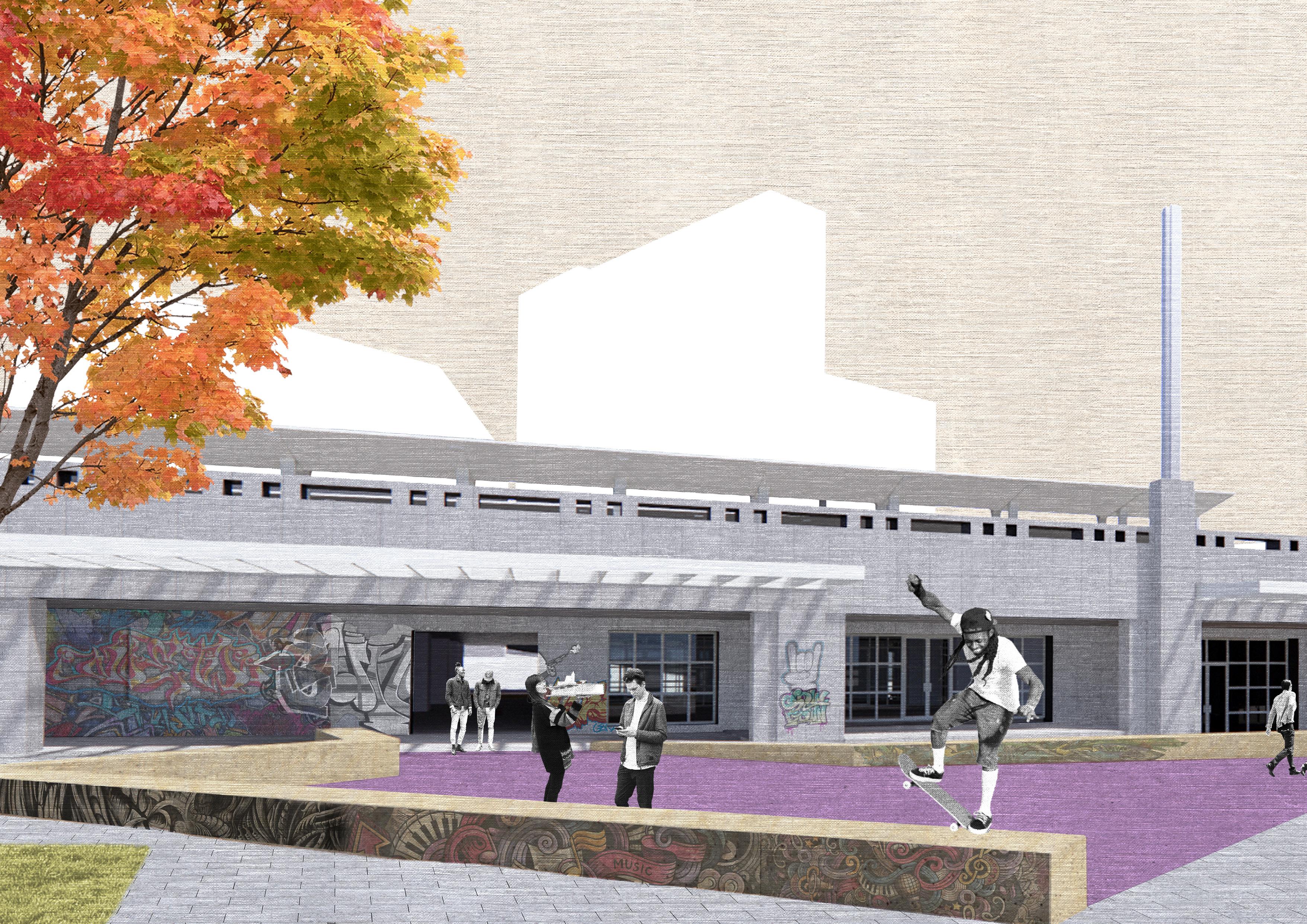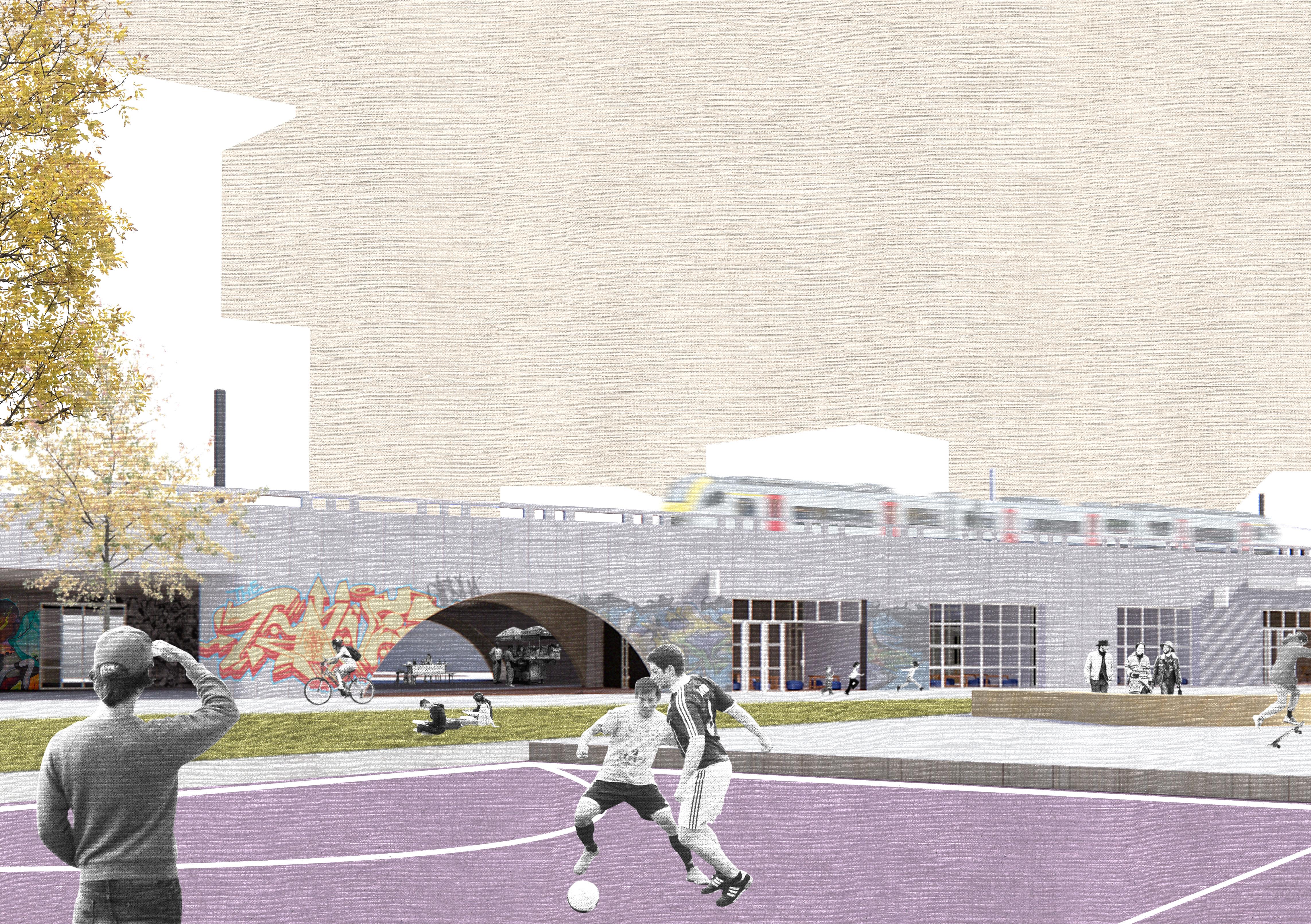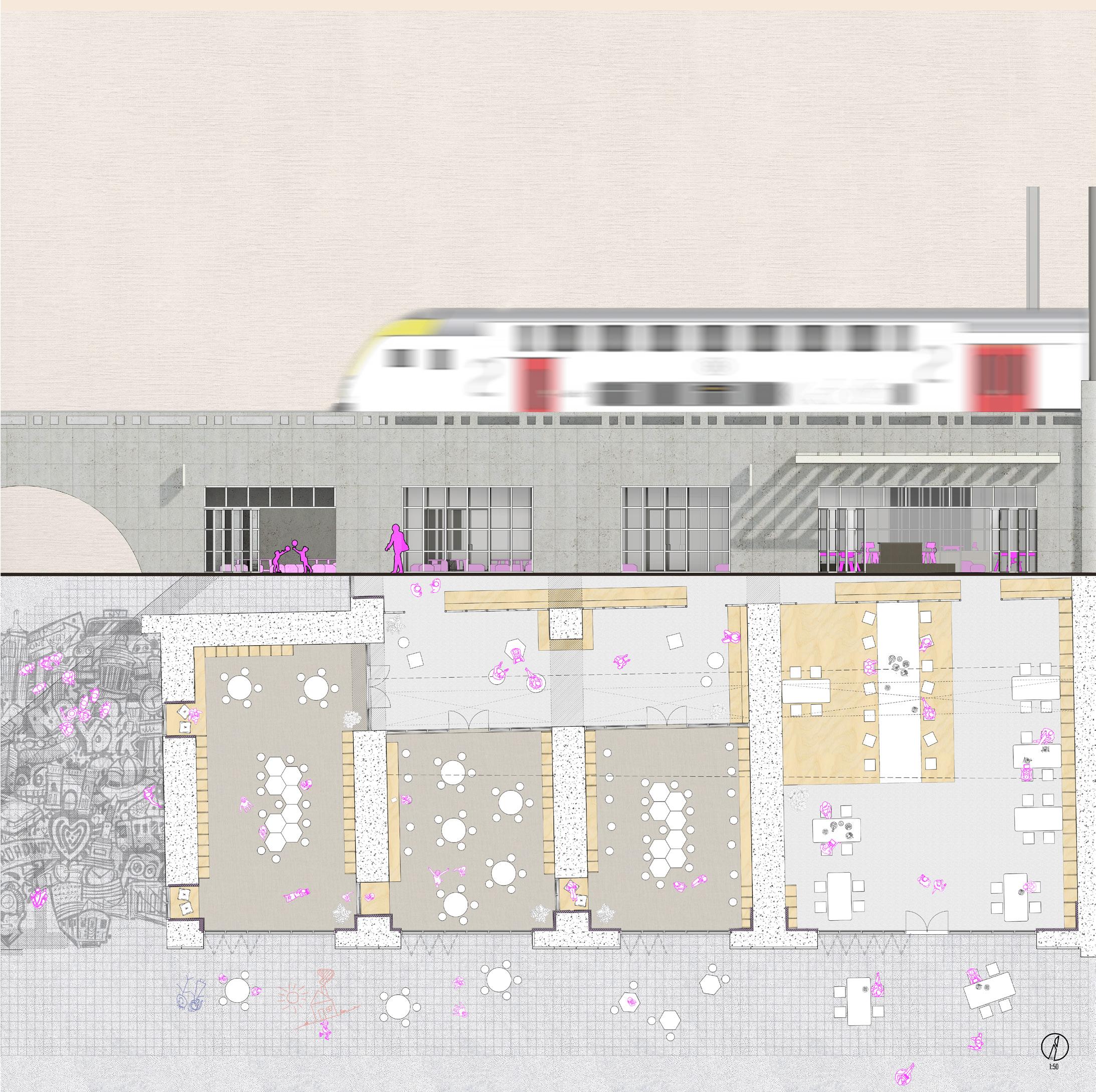 This projects is a research based design studio in which we indentified specific spatial- and social potential for an Architectural refurbishment. We came across the vacant spaces underneath the Ursuline-Skatepark and Chapelle-station, connecting Brussels North- and South station. Our research led to the conclusion that there was an increase in the number of children, sometimes very young, left to themselves. It became obvious that the presence of social-, cultural- and educational infrastructures surrounding the site had to be implemented.