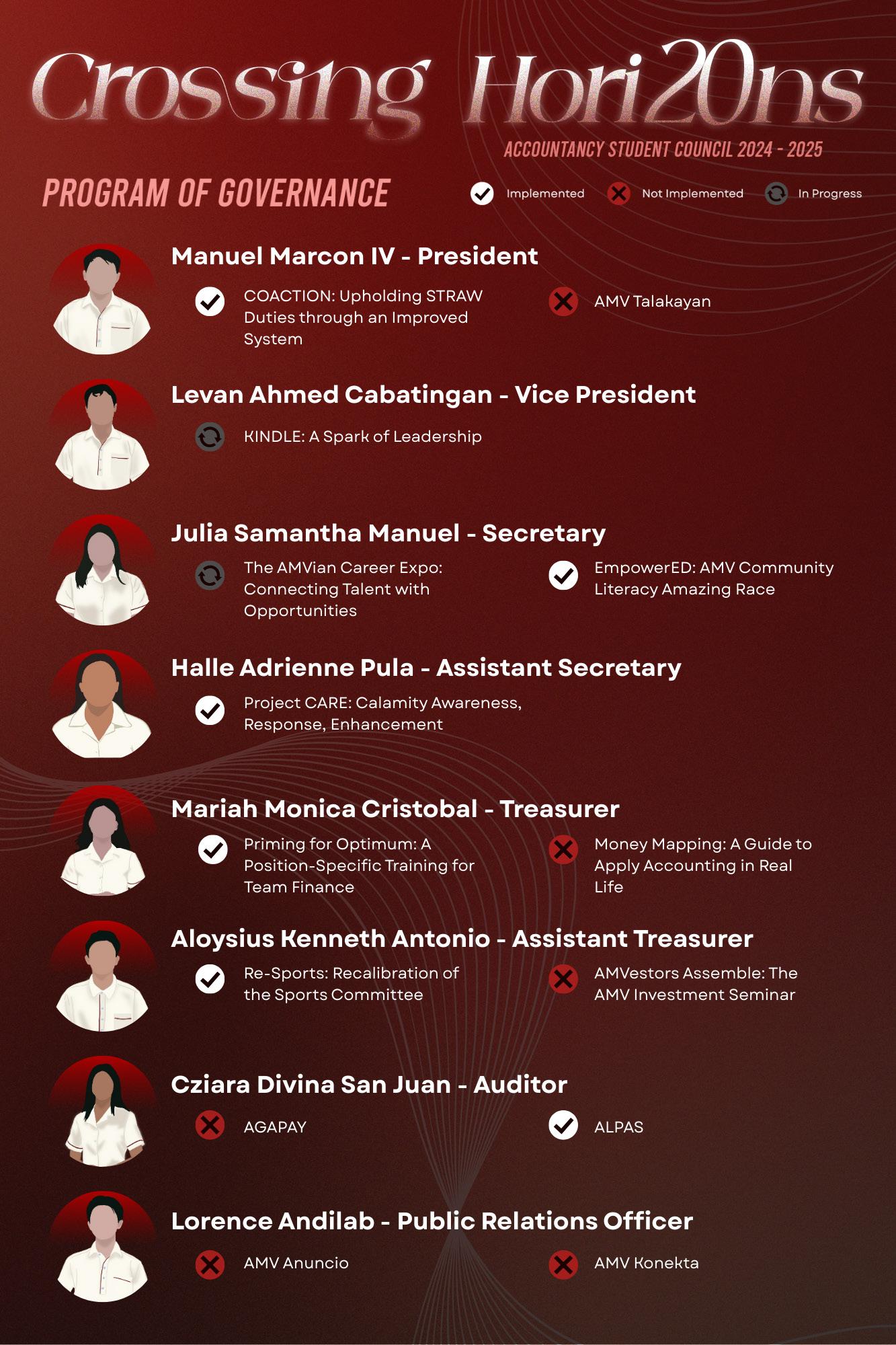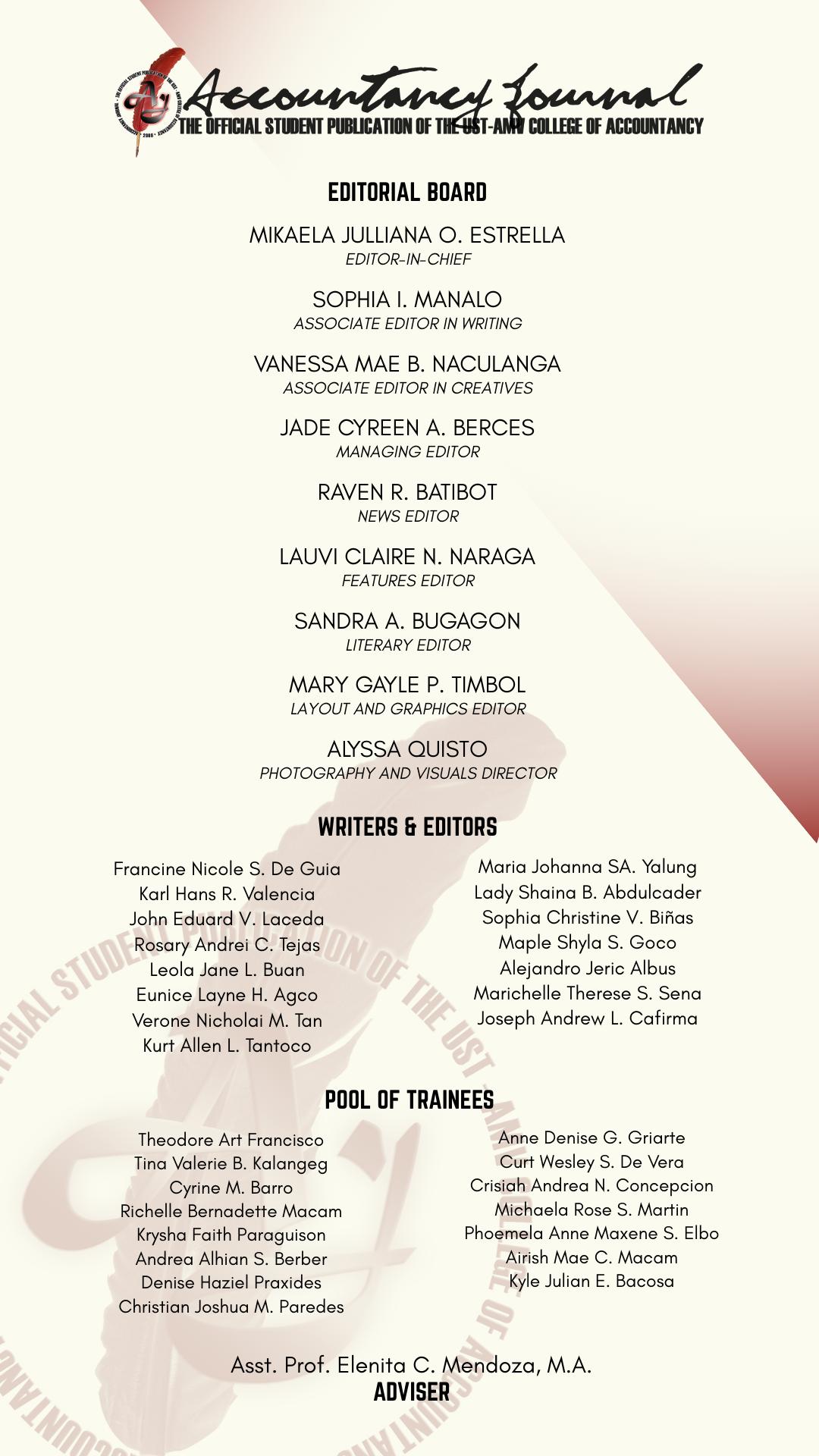 The Accountancy Journal aligns itself with the pursuit of truth, objectivity, and transparency—values that are not only foundational to journalism but essential to meaningful student leadership. As such, we aim to not only report but also to reflect, provoke thought, and encourage conversation about the issues that matter most to the AMVian community. In doing so, we hope to create space for both awareness and accountability, recognizing that effective leadership begins with honest engagement. As part of our continued commitment to fostering political awareness and encouraging active student involvement, we are proud to present this special edition of The Analyst, the official broadsheet of the USTAMV College of Accountancy.