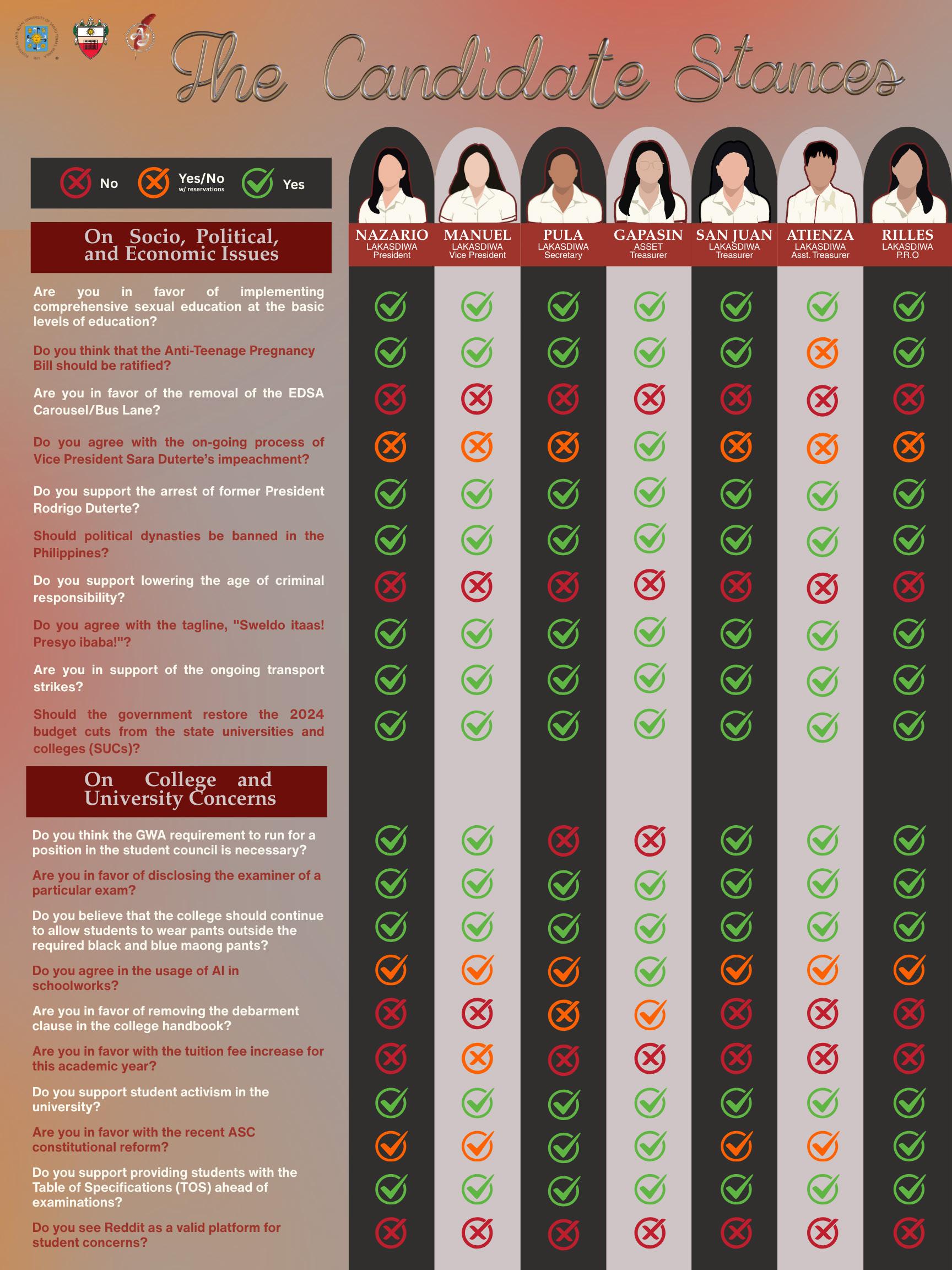 Candidates Halle Adrienne Pula and Hinkle Gapasin both support the ongoing impeachment of Vice President Sara Duterte and oppose the requirement for a General Weighted Average (GWA) to run for a position in the student council. Abram Jared Atienza is the sole candidate against ratifying the Anti-Teenage Pregnancy Bill, while Gapasin is the only one who favored lowering the age of criminal responsibility.