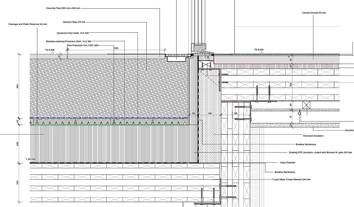 Detail drawing of level-free access from the green roof terrace to the separation floor. The insulation is made from EPS that is coated in bitumen and latex, resulting in a self-draining insulation.