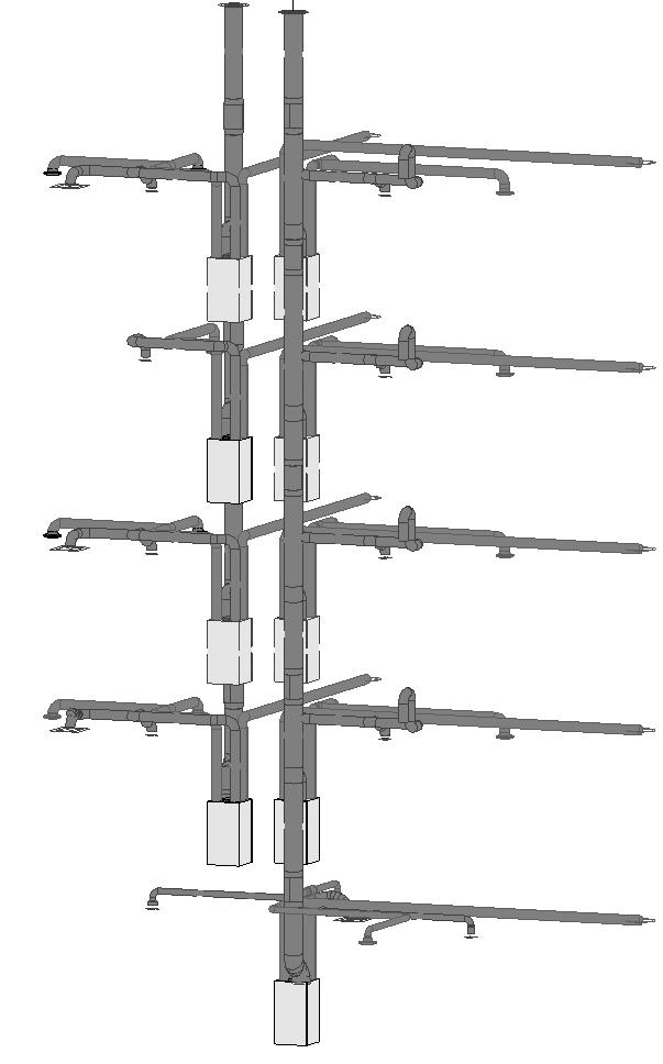 The ventilation project is constrained of a decentralized system. The air handling units are placed in each apartment, as well as the intake vent that is placed vertically on the external walls. Although, calculated exhaust ducts lead to the roof, in a combined system.