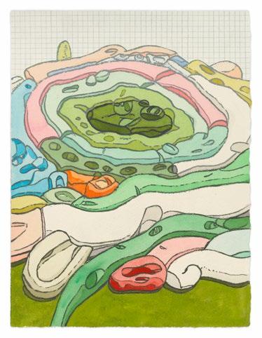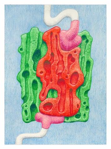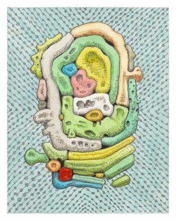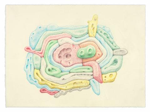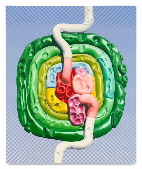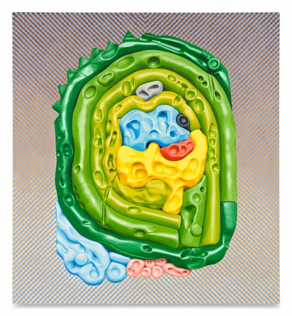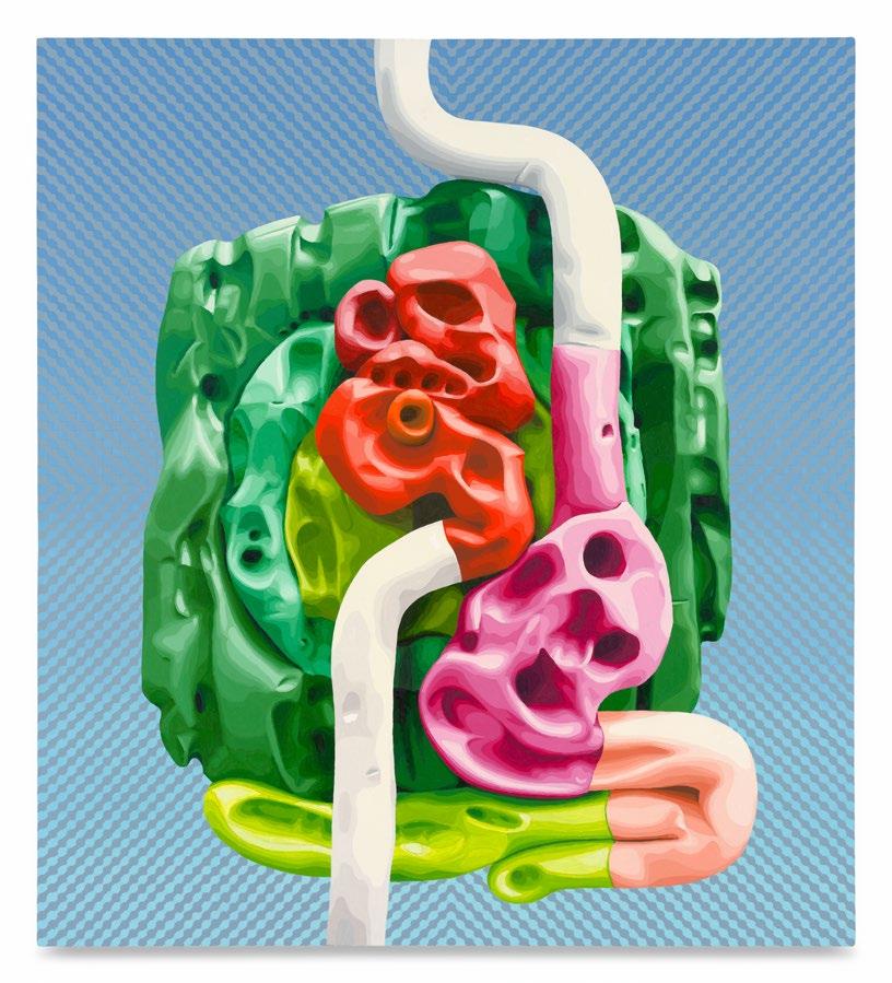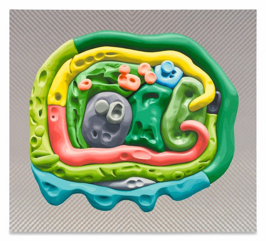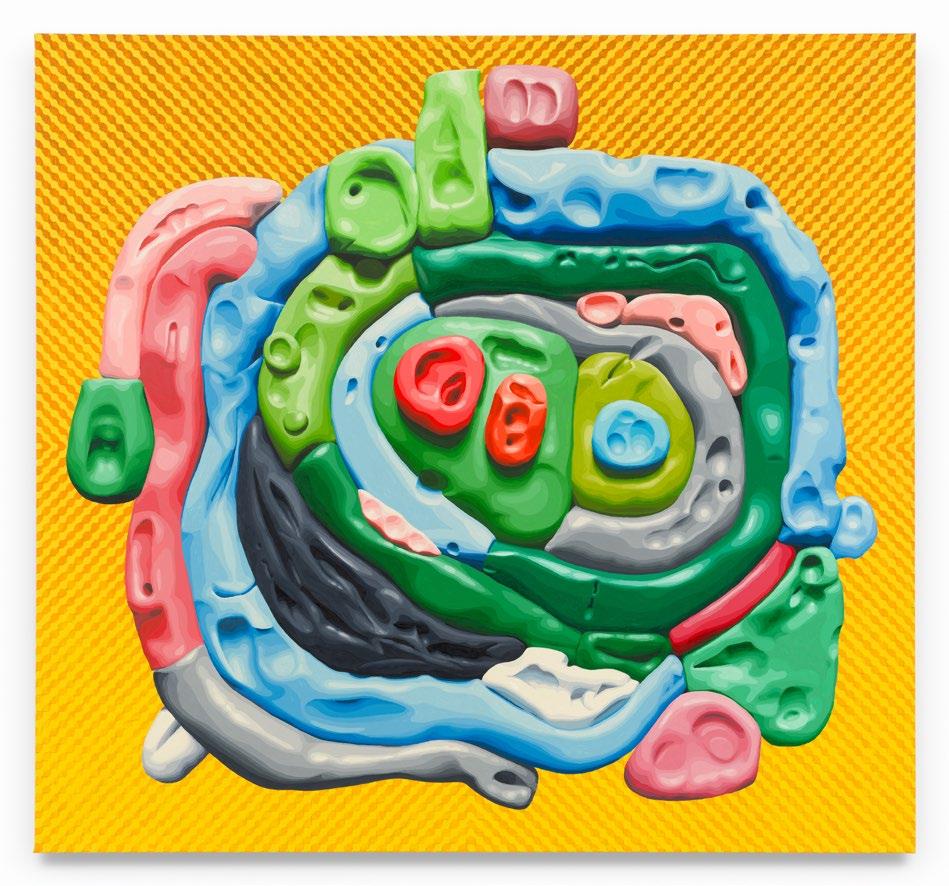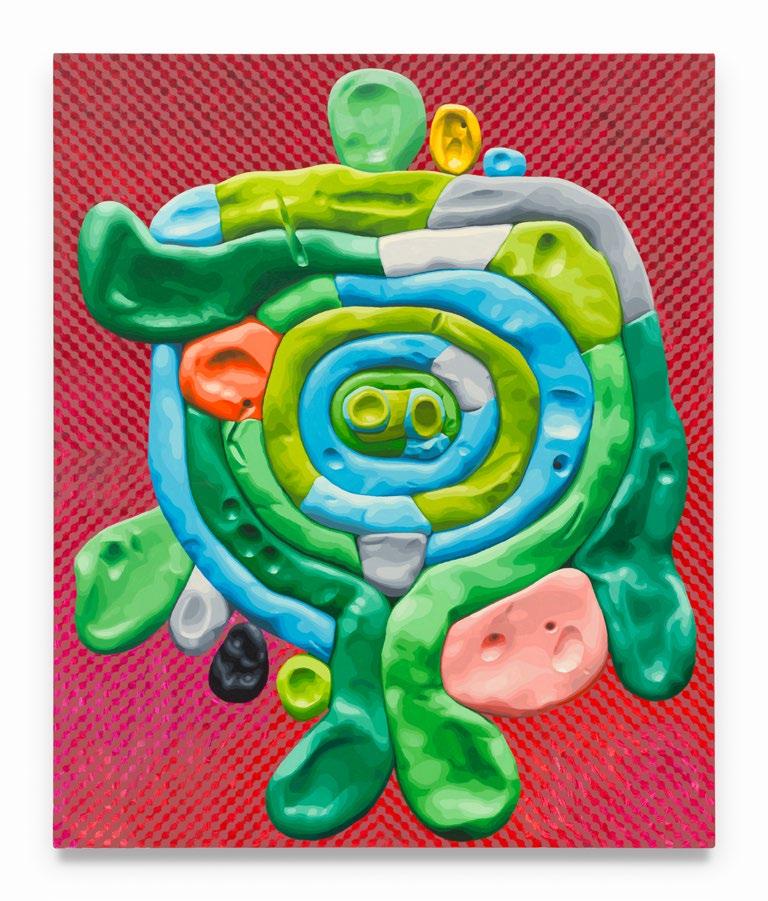 Ross’s newest series of paintings builds upon a long-standing interest in the biological sciences, an interest that has been translated into a remarkably distinct painterly language in which swarms of globular masses of color converge, morph, and detach from one another. There is a hyperreal quality to Ross’s compositions, as the selective placement of pockmarks, orifices, and protrusions in and around these strange forms evinces movement. The vibratory thrum of curved figures in tandem with the Precisionistic grouping of parts to their whole causes them to resemble what you would see under a microscope when you examine cells, bacteria, and microorganisms. Yet, the dynamism of Ross’s painterly buildup of these biomorphic shapes that float in an indeterminate space of endless chains causes the subjects to actively transform before our eyes into something altogether beyond nature or, more aptly, scientific explanation. Concurrently, these “biomorphic parts” seem to just as naturally fall into the camp of pure nonrepresentationalism—as vibrantly colored segments fitted into a formalist cohesion.
